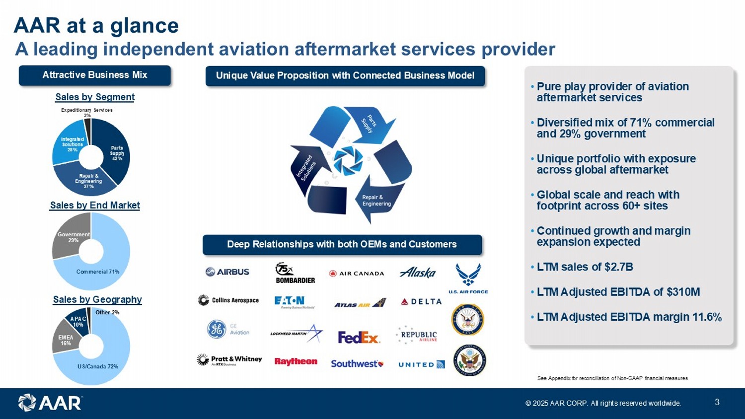 © 2025 AAR CORP. All rights reserved worldwide. 2 Forward - looking statements Note: All results and expectations in the presentation reflect continuing operations unless otherwise noted. This presentation contain s certain statements relating to future results, which are forward - looking statements as that term is defined in the Private Securities Litigation Reform Act of 1995, which reflect management’s expectations about future conditions , including, but not limited to, continued demand in the commercial and government aviation markets, anticipated activities and benefits under extended, expanded and new services, supply and distribution agreements, contributions from our acquisitio ns, leveraging strengths across our businesses, digital and intellectual property enabled offerings, progress on hangar expansions, continued sales growth, margin expansion, debt manage men t, capital allocation, expenses, production and cost efficiencies, and strategic acquisition opportunities . Forward - looking statements often address our expected future operating and financial performance and financial condition, or targets, goals, commitments, and other business plans, and often may also be identified because they contain words such as “anticipate,” “believe,” “continue,” “could,” “estimate,” “expect,” “intend,” “likely,” “may,” “might,” “plan,” “potential,” “predict,” “project,” “seek,” “should,” “target,” “will,” “would,” or similar expressions and the negatives of those terms. These forward - looking statements are based on the beliefs of Company management, as well as assumptions and estimates based on information available to the Company as of the dates such assumptions and estimates are made, and are subject to certain risks and uncertainties that could cause actual results to differ materially from historical results or those anticipated, depending on a variety of factors, including: (i) factors that adversely affect the commercial aviation industry; (ii) adverse events and negative publicity in the aviation industry; (iii) a reduction in sales to the U.S. government and its contractors; (iv) cost overruns and losses on fixed - price contracts; (v) nonperformance by subcontractors or suppliers; (vi) a reduction in outsourcing of maintenance activity by airlines; (vii) a shortage of skilled personnel or work stoppages; (viii) competition from other companies; (ix) financial, operational and legal risks arising as a result of operating internationally; (x) inability to integrate acquisitions effectively and execute operational and financial plans related to the acquisitions, such as the acquisition of Trax USA Corp. and the Product Support Business of Triumph Group , Inc.; (xi) failure to realize the anticipated benefits of acquisitions; (xii) circumstances associated with divestitures; (xiii) inability to recover costs due to fluctuations in market values for aviation products and equipment; (xiv) cyber or other security threats or disruptions; (xv) a need to make significant capital expenditures to keep pace with technological developments in our industry; (xvi) restrictions on use of intellectual property and tooling important to our business; (xvii) inability to fully execute our stock repurchase program and return capital to stockholders; (xviii) limitations on our ability to access the debt and equity capital markets or to draw down funds under loan agreements; (xix) non - compliance with restrictive and financial covenants contained in our debt and loan agreements; (xx) changes in or non - compliance with laws and regulations related to federal contractors, the aviation industry, international operations, safety, and environmental matters, and the costs of complying with such laws and regulations; and (xxi) exposure to product liability and property claims that may be in excess of our liability insurance coverage. Should one or more of those risks or uncertainties materialize adversely, or should underlying assumptions or estimates prove incorrect, actual results may vary materially from those described. Those events and uncertainties are difficult or impossible to predict accurately and many are beyond our control. For a discussion of these and other risks and uncertainties, refer to our Annual Report on Form 10 - K, Part I, “Item 1A, Risk Factors” and our other filings filed from time to time with the U.S. Securities and Exchange Commission. We assume no obligation to update any forward - looking statements to reflect events or circumstances after the date of such statements or to reflect the occurrence of anticipated or unanticipated events. Non - GAAP Financial Measures: This presentation includes certain non - GAAP financial measures. Please refer to the Appendix for additional information on these non - GAAP financial measures and reconciliations to the comparable GAAP measures. Unless otherwise noted, the statements made and the information provided in this presentation are as of May 28 , 202 5 .