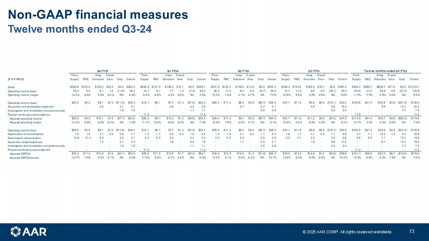 © 2025 AAR CORP. All rights reserved worldwide. 12 Non - GAAP financial measures Adjusted sales, adjusted operating income, adjusted operating margin, adjusted diluted earnings per share, adjusted EBITDA, adjusted EBITDA margin, adjusted pro forma EBITDA, net debt, net debt to adjusted EBITDA, and pro forma net debt to adjusted EBITDA are “non - GAAP financial measures” as defined in Regulation G of the Securities Exchange Act of 1934 , as amended (the “Exchange Act”) . We believe these non - GAAP financial measures are relevant and useful for investors as they illustrate our core operating performance unaffected by the impact of certain items that management does not believe are indicative of our ongoing and core operating activities . When reviewed in conjunction with our GAAP results and the accompanying reconciliations, we believe these non - GAAP financial measures provide additional information that is useful to gain an understanding of the factors and trends affecting our business and provide a means by which to compare our operating performance and leverage against that of other companies in the industries we compete . These non - GAAP measures should be considered as a supplement to, and not as a substitute for, or superior to, the corresponding measures calculated in accordance with GAAP . Adjusted EBITDA is income from continuing operations before interest income (expense), other income (expense), income taxes, depreciation and amortization, stock - based compensation, and items of an unusual nature including but not limited to business divestitures and acquisitions, workforce actions, COVID - related subsidies and costs, impairment and exit charges, facility consolidation and repositioning costs, FCPA investigation, settlement, and remediation compliance costs, pension settlement charges, certain legal judgments, acquisition, integration and amortization expenses from recent acquisition activity, and significant customer events such as early terminations, contract restructurings, forward loss provisions, and bankruptcies . Adjusted operating income is adjusted EBITDA gross of depreciation and amortization and stock - based compensation . Pursuant to the requirements of Regulation G of the Exchange Act, we are providing the following tables that reconcile the above - mentioned non - GAAP financial measures to the most directly comparable GAAP financial measures :