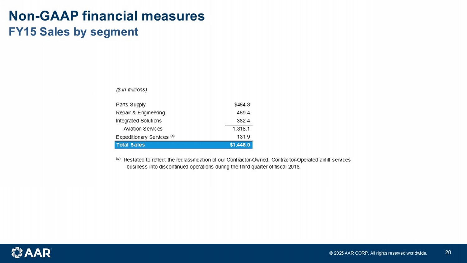 © 2025 AAR CORP. All rights reserved worldwide. 14 Twelve months ended Q3 - 25 Non - GAAP financial measures Q4 FY24 Q1 FY25 Q2 FY25 Q3 FY25 Twelve months ended Q3 FY25 Parts Integ Exped Parts Integ Exped Parts Integ Exped Parts Integ Exped Parts Integ Exped ($ in millions) Supply R&E Solutions Svcs Corp Consol Supply R&E Solutions Svcs Corp Consol Supply R&E Solutions Svcs Corp Consol Supply R&E Solutions Svcs Corp Consol Supply R&E Solutions Svcs Corp Consol Sales $260.3 $216.4 $163.5 $16.3 $0.0 $656.5 $249.7 $217.6 $168.9 $25.5 $0.0 $661.7 $273.7 $228.8 $163.4 $20.2 $0.0 $686.1 $270.7 $215.9 $162.9 $28.7 $0.0 $678.2 $1,054.4 $878.7 $658.7 $90.7 $0.0 $2,682.5 Operating income (loss) 35.2 20.6 1.2 0.4 (24.8) 32.6 30.1 21.1 7.7 (1.7) (13.8) 43.4 31.6 22.8 6.5 2.2 (65.4) (2.3) 45.4 19.0 9.6 6.4 (9.3) 71.1 142.3 83.5 25.0 7.3 (113.3) 144.8 Operating income margin 13.5% 9.5% 0.7% 2.5% NA 5.0% 12.1% 9.7% 4.6% -6.7% NA 6.6% 11.5% 10.0% 4.0% 10.9% NA -0.3% 16.8% 8.8% 5.9% 22.3% NA 10.5% 13.5% 9.5% 3.8% 8.0% NA 5.4% Sales $260.3 $216.4 $163.5 $16.3 $0.0 $656.5 $249.7 $217.6 $168.9 $25.5 $0.0 $661.7 $273.7 $228.8 $163.4 $20.2 $0.0 $686.1 $270.7 $215.9 $162.9 $28.7 $0.0 $678.2 $1,054.4 $878.7 $658.7 $90.7 $0.0 $2,682.5 Contract termination cost (benefit) - - 2.3 - - 2.3 - - - (9.5) - (9.5) - - - - - - - - - (4.0) - (4.0) - - 2.3 (13.5) - (11.2) Adjusted sales $260.3 $216.4 $165.8 $16.3 $0.0 $658.8 $249.7 $217.6 $168.9 $16.0 $0.0 $652.2 $273.7 $228.8 $163.4 $20.2 $0.0 $686.1 $270.7 $215.9 $162.9 $24.7 $0.0 $674.2 $1,054.4 $878.7 $661.0 $77.2 $0.0 $2,671.3 Operating income (loss) $35.2 $20.6 $1.2 $0.4 ($24.8) $32.6 $30.1 $21.1 $7.7 ($1.7) ($13.8) $43.4 $31.6 $22.8 $6.5 $2.2 ($65.4) ($2.3) $45.4 $19.0 $9.6 $6.4 ($9.3) $71.1 $142.3 $83.5 $25.0 $7.3 ($113.3) $144.8 Acquisition, integration and amortization expenses - 3.7 3.3 - 11.6 18.6 - 4.6 2.8 - 1.6 9.0 - 5.3 1.8 - 0.1 7.2 - 4.9 2.8 - (0.2) 7.5 - 18.5 10.7 - 13.1 42.3 FCPA settlement and investigation costs - - - - 4.8 4.8 - - - - 5.0 5.0 - - - - 59.2 59.2 - - - - 1.1 1.1 - - - - 70.1 70.1 Contract termination cost (benefit) - - 4.8 - - 4.8 - - - 3.2 - 3.2 - - - - - - - - - (3.0) - (3.0) - - 4.8 0.2 - 5.0 Gain related to sale of joint venture - - - - - - - (1.4) - - - (1.4) - (0.7) - - - (0.7) - - - - - - - (2.1) - - - (2.1) Severance - 0.5 - - - 0.5 - - - - - - - - - - - - - - - - - - - 0.5 - - - 0.5 Russian bankruptcy court judgment (reversal) - - - - - - - - - - - - - - - - - - (11.1) - - - - (11.1) (11.1) - - - - (11.1) Adjusted operating income $35.2 $24.8 $9.3 $0.4 ($8.4) $61.3 $30.1 $24.3 $10.5 $1.5 ($7.2) $59.2 $31.6 $27.4 $8.3 $2.2 ($6.1) $63.4 $34.3 $23.9 $12.4 $3.4 ($8.4) $65.6 $131.2 $100.4 $40.5 $7.5 ($30.1) $249.5 Adjusted operating margin 13.5% 11.5% 5.6% 2.5% NA 9.3% 12.1% 11.2% 6.2% 9.4% NA 9.1% 11.5% 12.0% 5.1% 10.9% NA 9.2% 12.7% 11.1% 7.6% 13.8% NA 9.7% 12.4% 11.4% 6.1% 9.7% NA 9.3% Operating income (loss) $35.2 $20.6 $1.2 $0.4 ($24.8) $32.6 $30.1 $21.1 $7.7 ($1.7) ($13.8) $43.4 $31.6 $22.8 $6.5 $2.2 ($65.4) ($2.3) $45.4 $19.0 $9.6 $6.4 ($9.3) $71.1 $142.3 $83.5 $25.0 $7.3 ($113.3) $144.8 Depreciation and amortization 2.9 6.3 4.0 0.4 1.7 15.3 2.1 6.2 3.7 0.4 1.1 13.5 1.8 6.3 4.4 0.4 1.1 14.0 1.9 6.5 4.2 0.4 1.0 14.0 8.7 25.3 16.3 1.6 4.9 56.8 Stock-based compensation 0.3 0.2 0.3 - 3.0 3.8 0.5 0.4 0.3 - 3.8 5.0 0.5 0.1 0.6 - 3.8 5.0 0.6 0.6 0.5 - 3.9 5.6 1.9 1.3 1.7 - 14.5 19.4 Acquisition and integration expenses - 0.7 2.3 - 11.6 14.6 - 1.6 1.8 - 1.6 5.0 - 2.4 0.8 - - 3.2 - 1.8 1.9 - (0.2) 3.5 - 6.5 6.8 - 13.0 26.3 FCPA settlement and investigation costs - - - - 4.8 4.8 - - - - 5.0 5.0 - - - - 59.2 59.2 - - - - 1.1 1.1 - - - - 70.1 70.1 Contract termination costs (benefit) - - 4.8 - - 4.8 - - - 3.2 - 3.2 - - - - - - - - - (3.0) - (3.0) - - 4.8 0.2 - 5.0 Gain related to sale of joint venture - - - - - - - (1.4) - - - (1.4) - (0.7) - - - (0.7) - - - - - - - (2.1) - - - (2.1) Severance - 0.5 - - - 0.5 - - - - - - - - - - - - - - - - - - - 0.5 - - - 0.5 Russian bankruptcy court judgment - - - - - - - - - - - - - - - - - - (11.1) - - - - (11.1) (11.1) - - - - (11.1) Adjusted EBITDA $38.4 $28.3 $12.6 $0.8 ($3.7) $76.4 $32.7 $27.9 $13.5 $1.9 ($2.3) $73.7 $33.9 $30.9 $12.3 $2.6 ($1.3) $78.4 $36.8 $27.9 $16.2 $3.8 ($3.5) $81.2 $141.8 $115.0 $54.6 $9.1 ($10.8) $309.7 Adjusted EBITDA margin 14.8% 13.1% 7.6% 4.9% NA 11.6% 13.1% 12.8% 8.0% 11.9% NA 11.3% 12.4% 13.5% 7.5% 12.9% NA 11.4% 13.6% 12.9% 9.9% 15.4% NA 12.0% 13.4% 13.1% 8.3% 11.8% NA 11.6%