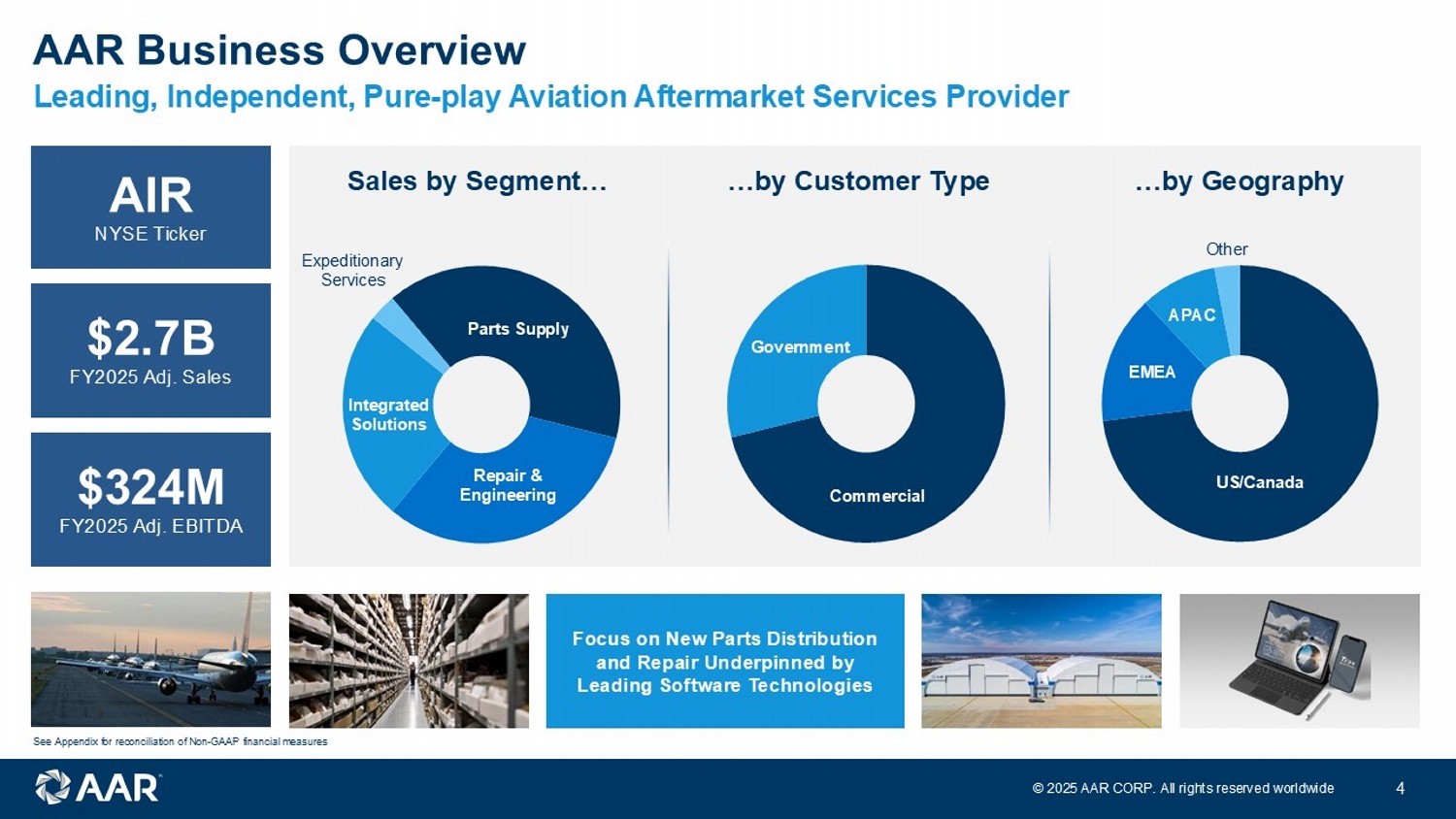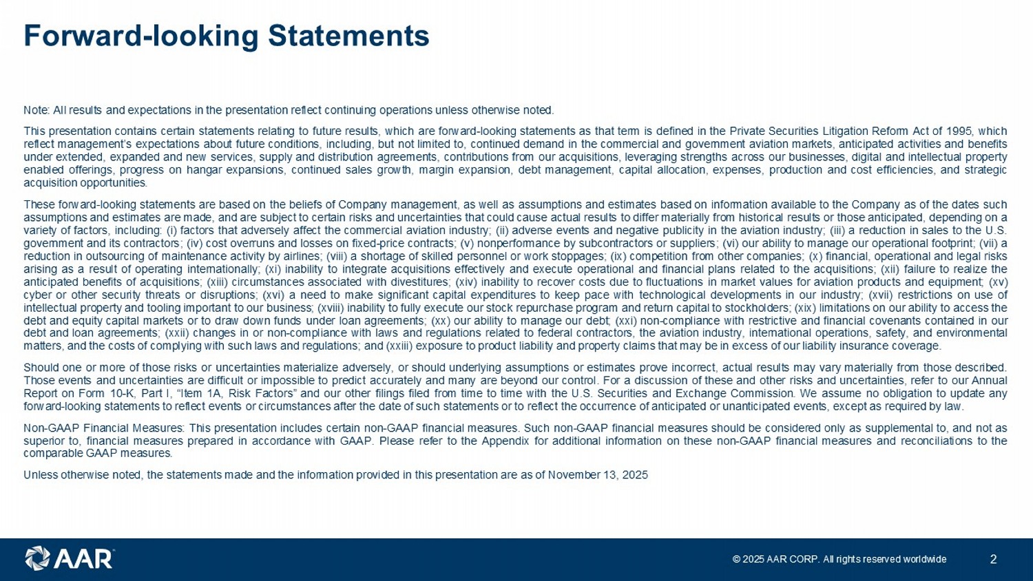 © 2025 AAR CORP. All rights reserved worldwide 2 Forward - looking Statements Note : All results and expectations in the presentation reflect continuing operations unless otherwise noted . This presentation contains certain statements relating to future results, which are forward - looking statements as that term is defined in the Private Securities Litigation Reform Act of 1995 , which reflect management’s expectations about future conditions, including, but not limited to, continued demand in the commercial and government aviation markets, anticipated activities and benefits under extended, expanded and new services, supply and distribution agreements, contributions from our acquisitions, leveraging strengths across our businesses, digital and intellectual property enabled offerings, progress on hangar expansions, continued sales growth, margin expansion, debt management, capital allocation, expenses, production and cost efficiencies, and strategic acquisition opportunities . These forward - looking statements are based on the beliefs of Company management, as well as assumptions and estimates based on information available to the Company as of the dates such assumptions and estimates are made, and are subject to certain risks and uncertainties that could cause actual results to differ materially from historical results or those anticipated, depending on a variety of factors, including : (i) factors that adversely affect the commercial aviation industry ; (ii) adverse events and negative publicity in the aviation industry ; (iii) a reduction in sales to the U . S . government and its contractors ; (iv) cost overruns and losses on fixed - price contracts ; (v) nonperformance by subcontractors or suppliers ; (vi) our ability to manage our operational footprint ; (vii) a reduction in outsourcing of maintenance activity by airlines ; (viii) a shortage of skilled personnel or work stoppages ; (ix) competition from other companies ; (x) financial, operational and legal risks arising as a result of operating internationally ; (xi) inability to integrate acquisitions effectively and execute operational and financial plans related to the acquisitions ; (xii) failure to realize the anticipated benefits of acquisitions ; (xiii) circumstances associated with divestitures ; (xiv) inability to recover costs due to fluctuations in market values for aviation products and equipment ; (xv) cyber or other security threats or disruptions ; (xvi) a need to make significant capital expenditures to keep pace with technological developments in our industry ; (xvii) restrictions on use of intellectual property and tooling important to our business ; (xviii) inability to fully execute our stock repurchase program and return capital to stockholders ; (xix) limitations on our ability to access the debt and equity capital markets or to draw down funds under loan agreements ; (xx) our ability to manage our debt ; (xxi) non - compliance with restrictive and financial covenants contained in our debt and loan agreements ; (xxii) changes in or non - compliance with laws and regulations related to federal contractors, the aviation industry, international operations, safety, and environmental matters, and the costs of complying with such laws and regulations ; and (xxiii) exposure to product liability and property claims that may be in excess of our liability insurance coverage . Should one or more of those risks or uncertainties materialize adversely, or should underlying assumptions or estimates prove incorrect, actual results may vary materially from those described . Those events and uncertainties are difficult or impossible to predict accurately and many are beyond our control . For a discussion of these and other risks and uncertainties, refer to our Annual Report on Form 10 - K, Part I, “Item 1 A, Risk Factors” and our other filings filed from time to time with the U . S . Securities and Exchange Commission . We assume no obligation to update any forward - looking statements to reflect events or circumstances after the date of such statements or to reflect the occurrence of anticipated or unanticipated events, except as required by law . Non - GAAP Financial Measures : This presentation includes certain non - GAAP financial measures . Such non - GAAP financial measures should be considered only as supplemental to, and not as superior to, financial measures prepared in accordance with GAAP . Please refer to the Appendix for additional information on these non - GAAP financial measures and reconciliations to the comparable GAAP measures . Unless otherwise noted, the statements made and the information provided in this presentation are as of November 13 , 2025