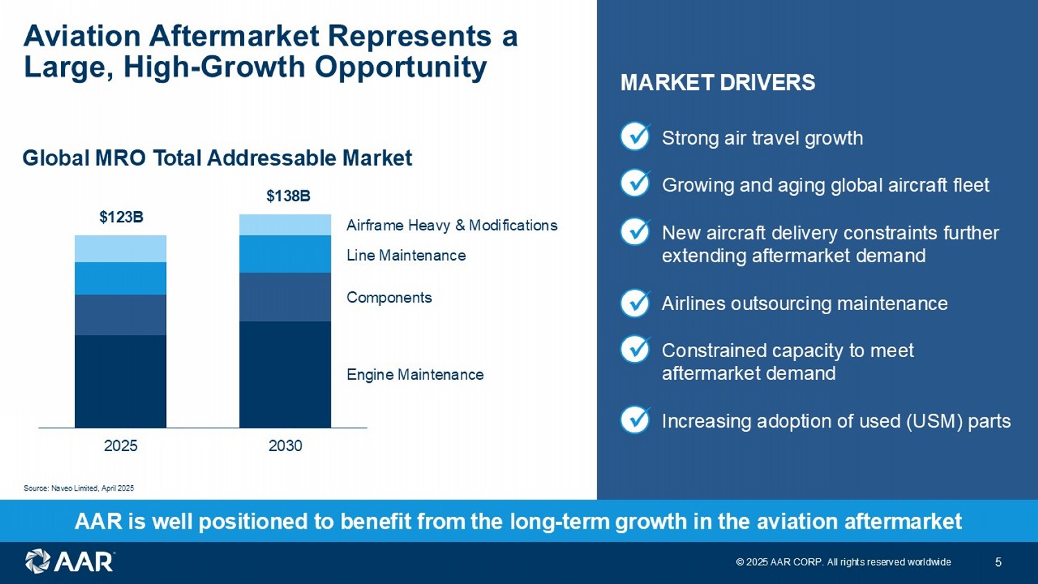 Focus on New Parts Distribution and Repair Underpinned by Leading Software Technologies © 2025 AAR CORP. All rights reserved worldwide 4 Leading, Independent, Pure - play Aviation Aftermarket Services Provider AAR Business Overview Parts Supply Repair & Engineering Integrated Solutions Expeditionary Services Sales by Segment… See Appendix for reconciliation of Non - GAAP financial measures AIR NYSE Ticker $2.7B FY2025 Adj. Sales $324M FY2025 Adj. EBITDA Commercial Government US/Canada EMEA APAC Other …by Customer Type …by Geography