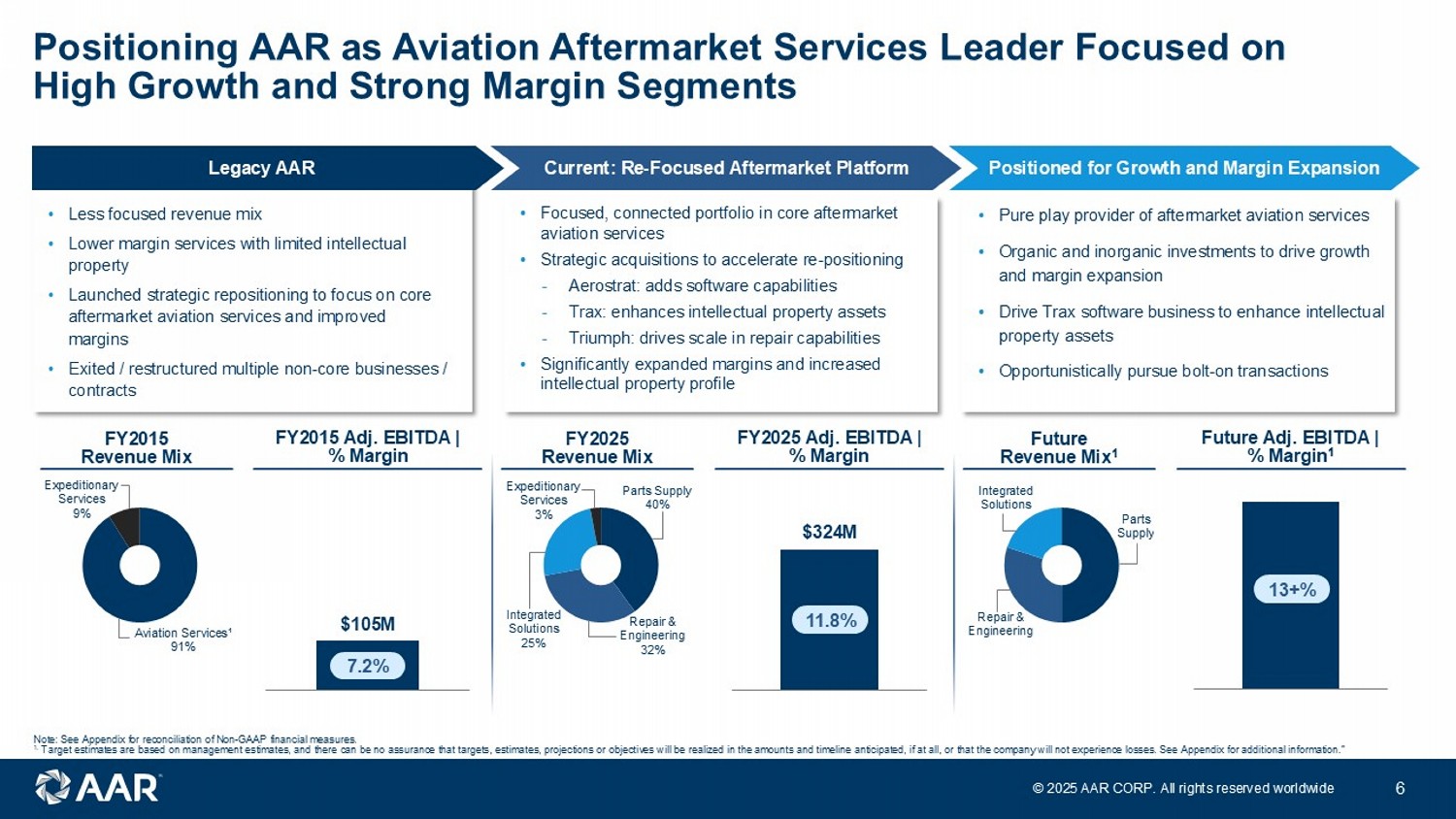 Note: See Appendix for reconciliation of Non - GAAP financial measures © 2025 AAR CORP. All rights reserved worldwide 5 Aviation Aftermarket Represents a Large, High - Growth Opportunity MARKET DRIVERS Strong air travel growth Growing and aging global aircraft fleet New aircraft delivery constraints further extending aftermarket demand Airlines outsourcing maintenance Constrained capacity to meet aftermarket demand Increasing adoption of used (USM) parts 7.2% Margin 11.8% Margin AAR is well positioned to benefit from the long - term growth in the aviation aftermarket Global MRO Total Addressable Market 2025 2030 Engine Maintenance Components Line Maintenance Airframe Heavy & Modifications $138B $123B Source: Naveo Limited, April 2025 x x x x x x