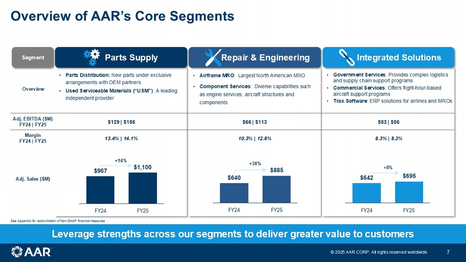 © 2025 AAR CORP. All rights reserved worldwide 6 Positioning AAR as Aviation Aftermarket Services Leader Focused on High Growth and Strong Margin Segments Note: See Appendix for reconciliation of Non - GAAP financial measures. 1. Target estimates are based on management estimates, and there can be no assurance that targets, estimates, projections or obj ec tives will be realized in the amounts and timeline anticipated, if at all, or that the company will not experience losses. Se e A ppendix for additional information.” $324M $105M Parts Supply 40% Repair & Engineering 32% Integrated Solutions 25% Expeditionary Services 3% FY2015 Revenue Mix FY2015 Adj. EBITDA | % Margin • Less focused revenue mix • Lower margin services with limited intellectual property • Launched strategic repositioning to focus on core aftermarket aviation services and improved margins • Exited / restructured multiple non - core businesses / contracts • Focused, connected portfolio in core aftermarket aviation services • Strategic acquisitions to accelerate re - positioning - Aerostrat : adds software capabilities - Trax: enhances intellectual property assets - Triumph: drives scale in repair capabilities • Significantly expanded margins and increased intellectual property profile • Pure play provider of aftermarket aviation services • Organic and inorganic investments to drive growth and margin expansion • Drive Trax software business to enhance intellectual property assets • Opportunistically pursue bolt - on transactions Legacy AAR Current: Re - Focused Aftermarket Platform Positioned for Growth and Margin Expansion FY2025 Revenue Mix FY2025 Adj. EBITDA | % Margin Future Revenue Mix 1 Future Adj. EBITDA | % Margin 1 Parts Supply Repair & Engineering Integrated Solutions Aviation Services¹ 91% Expeditionary Services 9% 11.8% 13+% 7.2%
