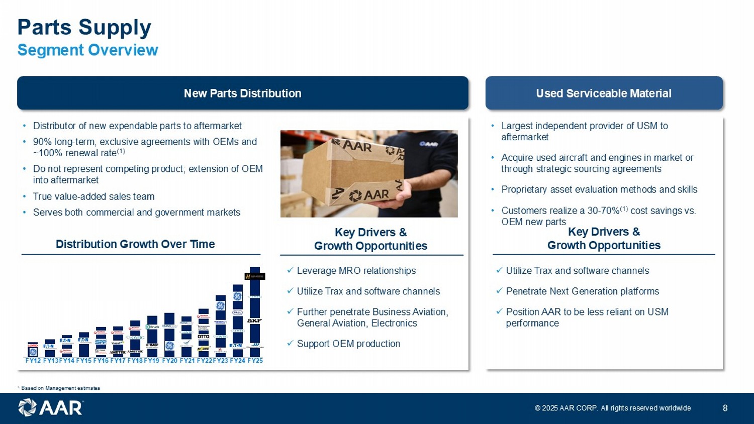 Parts Supply • Parts Distribution: New parts under exclusive arrangements with OEM partners • Used Serviceable Materials (“USM”) : A leading independent provider $129 | $156 13.4% | 14.1% $967 $1,100 FY24 FY25 +14% Repair & Engineering $66 | $113 10.3% | 12.8% $640 $885 FY24 FY25 +38% • Airframe MRO : Largest North American MRO • Component Services : Diverse capabilities such as engine services, aircraft structures and components Integrated Solutions $53 | $56 8.3% | 8.3% $642 $695 FY24 FY25 + 8% • Government Services : Provides complex logistics and supply chain support programs • Commercial Services : Offers flight - hour - based aircraft support programs • Trax Software : ERP solutions for airlines and MROs Overview of AAR’s Core Segments Leverage strengths across our segments to deliver greater value to customers Overview Adj. Sales ($M) Adj. EBITDA ($M) FY24 | FY25 Margin FY24 | FY25 Segment © 2025 AAR CORP. All rights reserved worldwide 7 See Appendix for reconciliation of Non - GAAP financial measures