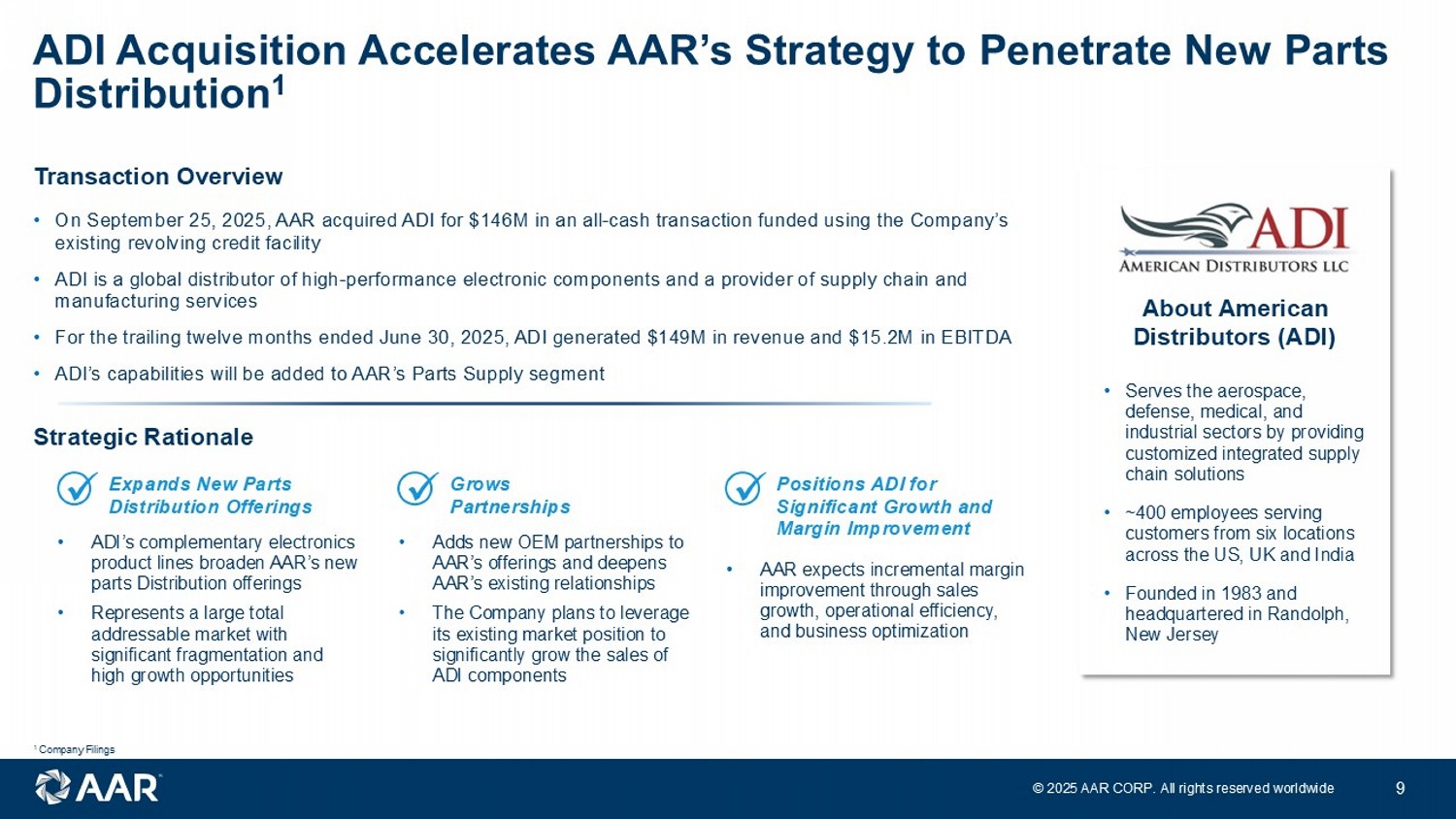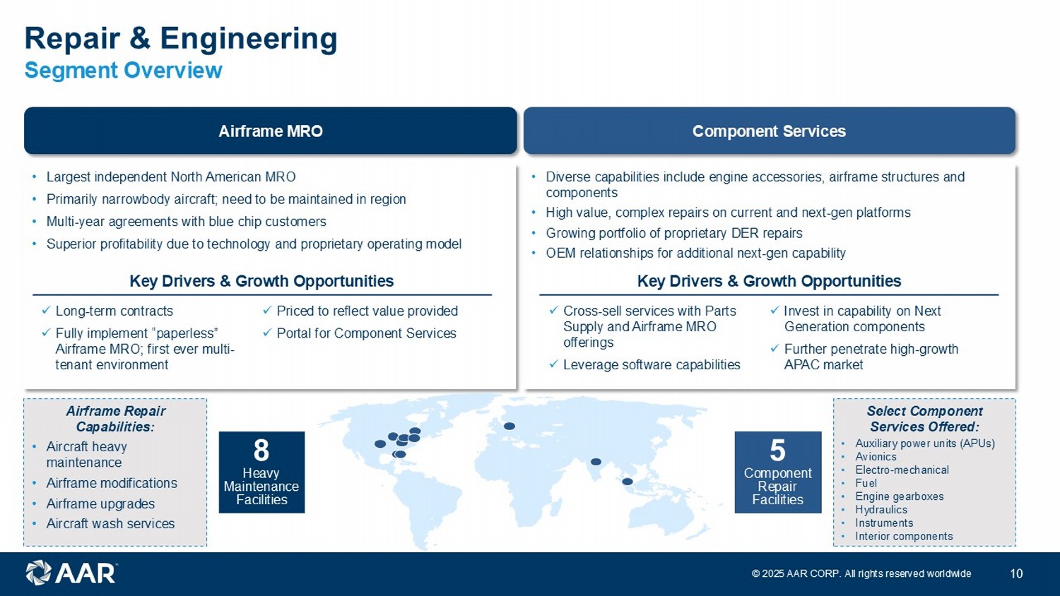 © 2025 AAR CORP. All rights reserved worldwide 9 ADI Acquisition Accelerates AAR’s Strategy to Penetrate New Parts Distribution 1 Transaction Overview • On September 25, 2025, AAR acquired ADI for $146M in an all - cash transaction funded using the Company’s existing revolving credit facility • ADI is a global distributor of high - performance electronic components and a provider of supply chain and manufacturing services • For the trailing twelve months ended June 30, 2025, ADI generated $ 149M in revenue and $15.2M in EBITDA • ADI’s capabilities will be added to AAR’s Parts Supply segment Strategic Rationale x • ADI’s complementary electronics product lines broaden AAR’s new parts Distribution offerings • Represents a large total addressable market with significant fragmentation and high growth opportunities Expands New Parts Distribution Offerings x • Adds new OEM partnerships to AAR’s offerings and deepens AAR’s existing relationships • The Company plans to leverage its existing market position to significantly grow the sales of ADI components Grows Partnerships x • AAR expects incremental margin improvement through sales growth, operational efficiency, and business optimization Positions ADI for Significant Growth and Margin Improvement About American Distributors (ADI) • Serves the aerospace, defense, medical, and industrial sectors by providing customized integrated supply chain solutions • ~400 employees serving customers from six locations across the US, UK and India • Founded in 1983 and headquartered in Randolph, New Jersey 1 Company Filings