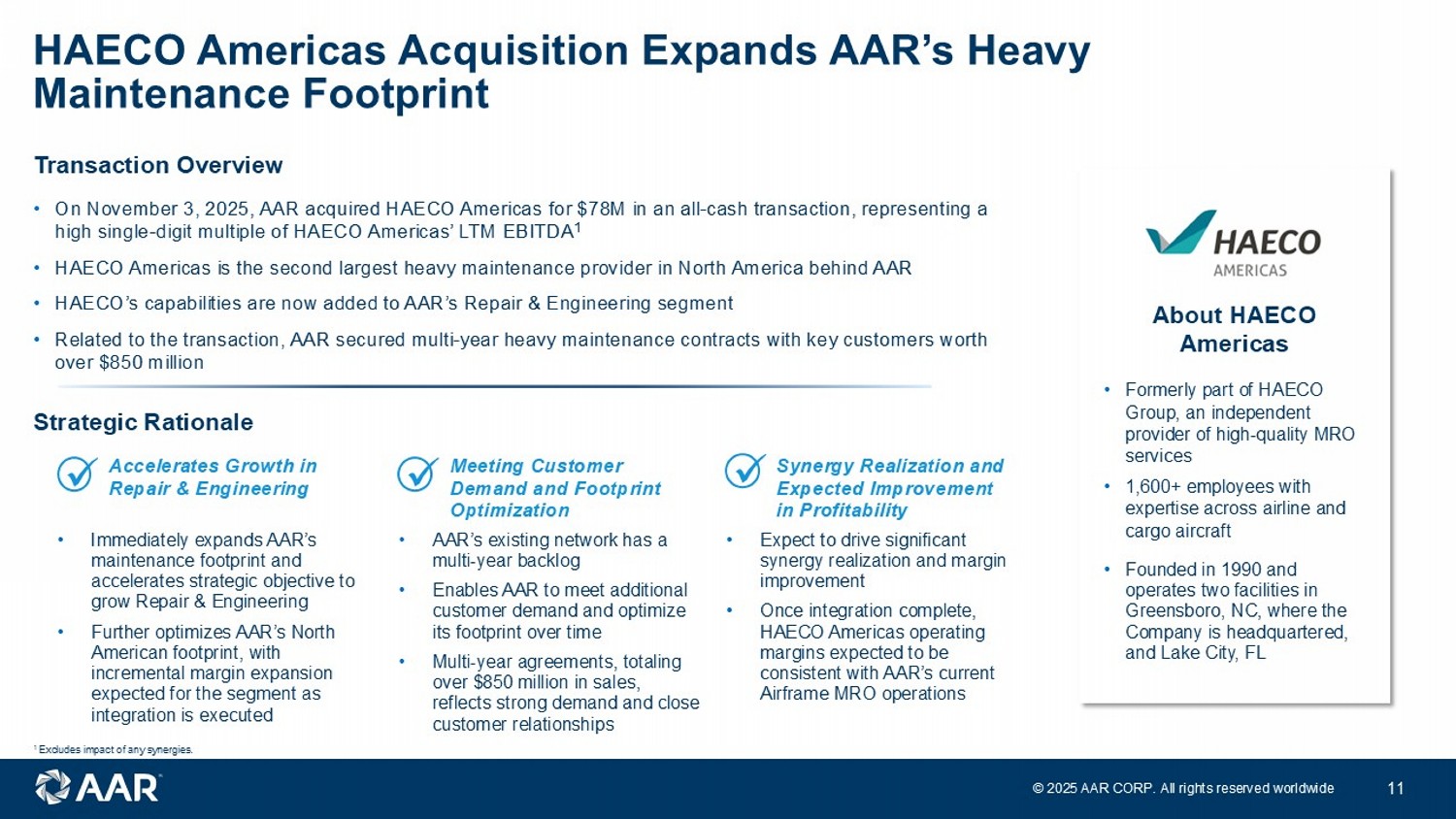 © 2025 AAR CORP. All rights reserved worldwide 10 Segment Overview Repair & Engineering Airframe MRO • Largest independent North American MRO • Primarily narrowbody aircraft; need to be maintained in region • Multi - year agreements with blue chip customers • Superior profitability due to technology and proprietary operating model Key Drivers & Growth Opportunities x Long - term contracts x Fully implement “paperless” Airframe MRO; first ever multi - tenant environment x Priced to reflect value provided x Portal for Component Services Component Services • Diverse capabilities include engine accessories, airframe structures and components • High value, complex repairs on current and next - gen platforms • Growing portfolio of proprietary DER repairs • OEM relationships for additional next - gen capability 8 Heavy Maintenance Facilities Key Drivers & Growth Opportunities x Cross - sell services with Parts Supply and Airframe MRO offerings x Leverage software capabilities x Invest in capability on Next Generation components x Further penetrate high - growth APAC market 5 Component Repair Facilities Airframe Repair Capabilities: • Aircraft heavy maintenance • Airframe modifications • Airframe upgrades • Aircraft wash services Select Component Services Offered: • Auxiliary power units (APUs) • Avionics • Electro - mechanical • Fuel • Engine gearboxes • Hydraulics • Instruments • Interior components
