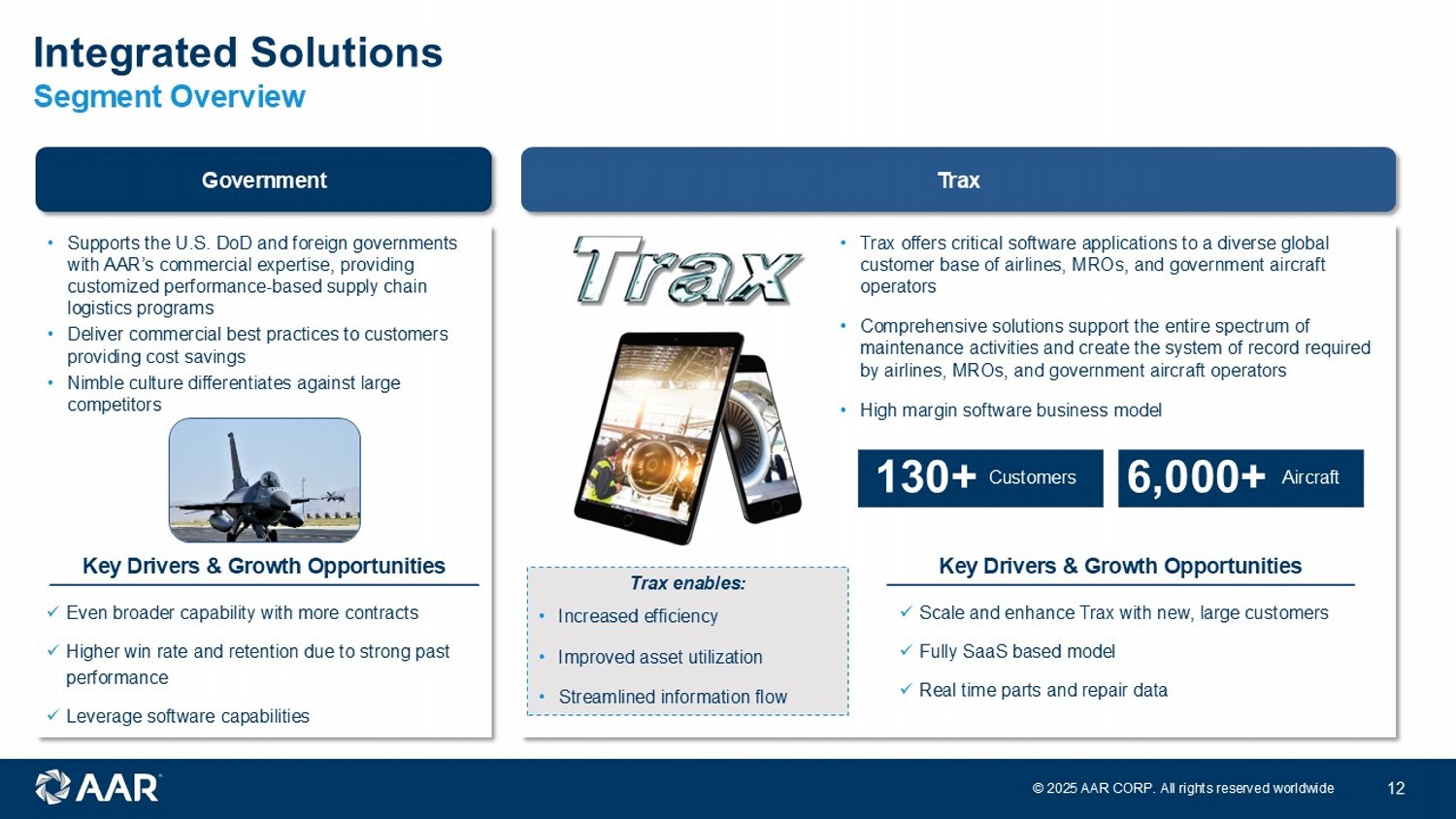 © 2025 AAR CORP. All rights reserved worldwide 11 HAECO Americas Acquisition Expands AAR’s Heavy Maintenance Footprint Transaction Overview • On November 3, 2025, AAR acquired HAECO Americas for $78M in an all - cash transaction, representing a high single - digit multiple of HAECO Americas’ LTM EBITDA 1 • HAECO Americas is the second largest heavy maintenance provider in North America behind AAR • HAECO’s capabilities are now added to AAR’s Repair & Engineering segment • Related to the transaction, AAR secured multi - year heavy maintenance contracts with key customers worth over $850 million Strategic Rationale x • Immediately expands AAR’s maintenance footprint and accelerates strategic objective to grow Repair & Engineering • Further optimizes AAR’s North American footprint, with incremental margin expansion expected for the segment as integration is executed Accelerates Growth in Repair & Engineering x • AAR’s existing network has a multi - year backlog • Enables AAR to meet additional customer demand and optimize its footprint over time • Multi - year agreements, totaling over $850 million in sales, reflects strong demand and close customer relationships Meeting Customer Demand and Footprint Optimization x • Expect to drive significant synergy realization and margin improvement • Once integration complete, HAECO Americas operating margins expected to be consistent with AAR’s current Airframe MRO operations Synergy Realization and Expected Improvement in Profitability About HAECO Americas • Formerly part of HAECO Group, an independent provider of high - quality MRO services • 1,600+ employees with expertise across airline and cargo aircraft • Founded in 1990 and operates two facilities in Greensboro, NC, where the Company is headquartered, and Lake City, FL 1 Excludes impact of any synergies.