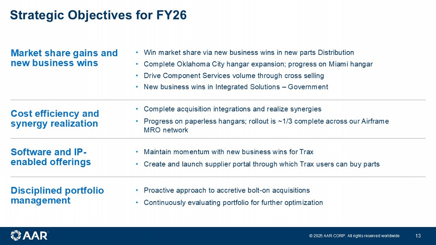 © 2025 AAR CORP. All rights reserved worldwide 12 Segment Overview Integrated Solutions Trax • Trax offers critical software applications to a diverse global customer base of airlines, MROs, and government aircraft operators • Comprehensive solutions support the entire spectrum of maintenance activities and create the system of record required by airlines, MROs, and government aircraft operators • High margin software business model x Scale and enhance Trax with new, large customers x Fully SaaS based model x Real time parts and repair data Government • Supports the U.S. DoD and foreign governments with AAR’s commercial expertise, providing customized performance - based supply chain logistics programs • Deliver commercial best practices to customers providing cost savings • Nimble culture differentiates against large competitors Government Key Drivers & Growth Opportunities Key Drivers & Growth Opportunities Trax enables: • Increased efficiency • Improved asset utilization • Streamlined information flow Customers 130+ Aircraft 6,000+ x Even broader capability with more contracts x Higher win rate and retention due to strong past performance x Leverage software capabilities