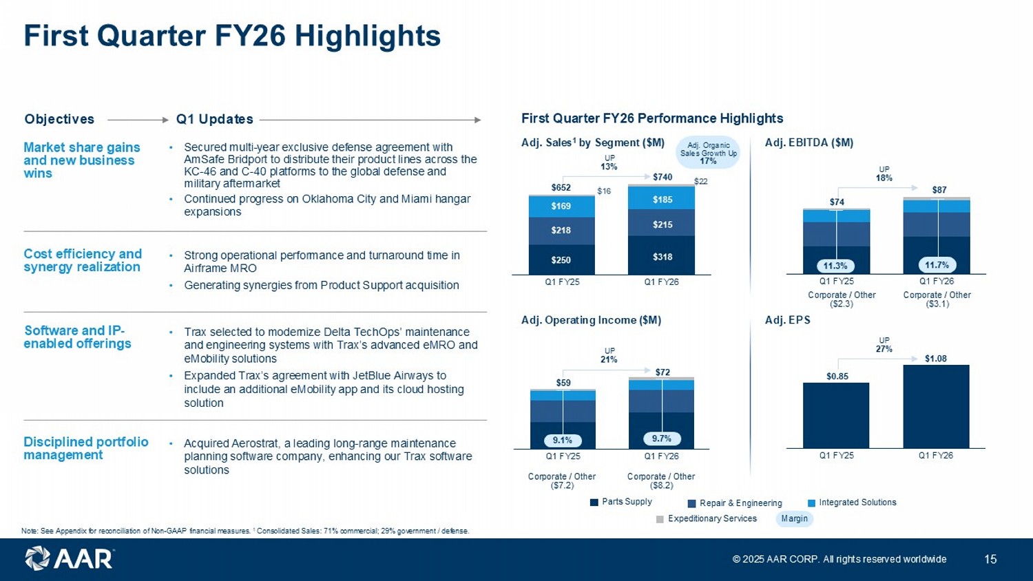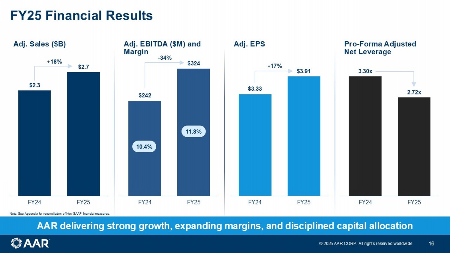 Q1 FY25 Q1 FY26 $0.85 $1.08 Q1 FY25 Q1 FY26 $59 $72 9.1% 9.7% Q1 FY25 Q1 FY26 $87 $74 11.7% 11.3% Q1 FY25 Q1 FY26 $250 $318 $215 $185 $218 $169 $740 $652 $16 $22 © 2025 AAR CORP. All rights reserved worldwide 15 First Quarter FY26 Highlights First Quarter FY26 Performance Highlights Market share gains and new business wins • Secured multi - year exclusive defense agreement with AmSafe Bridport to distribute their product lines across the KC - 46 and C - 40 platforms to the global defense and military aftermarket • Continued progress on Oklahoma City and Miami hangar expansions Cost efficiency and synergy realization • Strong operational performance and turnaround time in Airframe MRO • Generating synergies from Product Support acquisition • Trax selected to modernize Delta TechOps’ maintenance and engineering systems with Trax’s advanced eMRO and eMobility solutions • Expanded Trax’s agreement with JetBlue Airways to include an additional eMobility app and its cloud hosting solution Software and IP - enabled offerings Disciplined portfolio management • Acquired Aerostrat , a leading long - range maintenance planning software company, enhancing our Trax software solutions Objectives Q1 Updates Parts Supply Repair & Engineering Integrated Solutions Expeditionary Services Margin Adj. Sales 1 by Segment ($M) Adj. Operating Income ($M) Adj. EBITDA ($M) Adj. EPS UP 13% UP 18% UP 21% UP 27% Corporate / Other ($7.2) Corporate / Other ($8.2) Corporate / Other ($2.3) Corporate / Other ($3.1) Note: See Appendix for reconciliation of Non - GAAP financial measures. 1 Consolidated Sales: 71% commercial; 29% government / defense. Adj. Organic Sales Growth Up 17%
