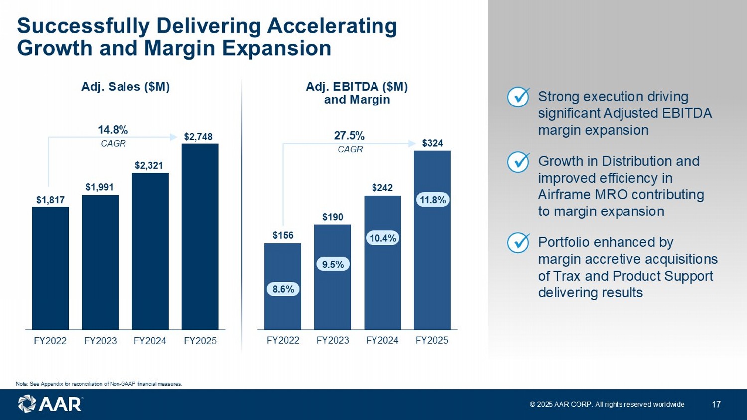 3.30x 2.72x FY24 FY25 $3.33 $3.91 FY24 FY25 $2.3 $2.7 FY24 FY25 $242 $324 FY24 FY25 © 2025 AAR CORP. All rights reserved worldwide 16 FY25 Financial Results + 18% Adj. Sales ($B) Adj. EBITDA ($M) and Margin Adj. EPS Pro - Forma Adjusted Net Leverage + 34% + 17% 10.4% 11.8% Note: See Appendix for reconciliation of Non - GAAP financial measures. AAR delivering strong growth, expanding margins, and disciplined capital allocation