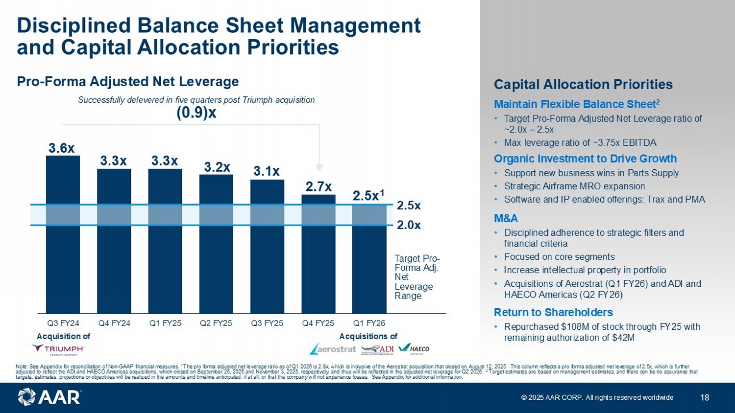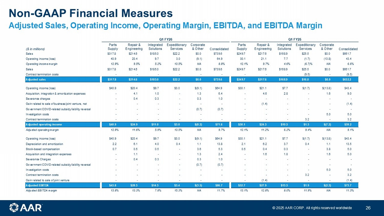 © 2025 AAR CORP. All rights reserved worldwide 25 Non - GAAP Financial Measures Pro - Forma Adjusted Net Leverage 1 Amounts adjusted to include certain transactions completed in Q2 FY 2026 including the acquisitions of ADI Electronics and HA ECO Americas and our equity offering. Total debt $277.0 $997.0 $992.0 $997.0 $1,032.0 $977.0 $1,030.0 Less: cash and cash equivalents (69.2) (85.8) (49.3) (61.7) (84.4) (96.5) (80.0) Net debt $207.8 $911.2 $942.7 $935.3 $947.6 $880.5 $950.0 Adjusted EBITDA for the twelve months ended $219.0 $242.4 $264.0 $287.1 $309.7 $324.2 $337.2 Net debt to Adjusted EBITDA 0.95x 3.76x 3.57x 3.26x 3.06x 2.72x 2.82x Net debt $207.8 $911.2 $942.7 $935.3 $947.6 $880.5 $950.0 Product Support consideration plus fees of $30.3 million 755.3 n/a n/a n/a n/a n/a n/a ADI Electronics consideration plus fees of $4.1 million 1 n/a n/a n/a n/a n/a n/a 150.1 HAECO Americas consideration plus fees of $2.8 million 1 n/a n/a n/a n/a n/a n/a 79.4 Proceeds from equity offering, net 1 n/a n/a n/a n/a n/a n/a (274.0) Pro forma net debt $963.1 n/a n/a n/a n/a n/a $905.5 Adjusted EBITDA for the twelve months ended $219.0 $242.4 $264.0 $287.1 $309.7 $324.2 $337.2 Product Support adjusted EBITDA Twelve months ended February 29, 2024 49.9 n/a n/a n/a n/a n/a n/a Nine months ended February 29, 2024 n/a 33.5 n/a n/a n/a n/a n/a Six months ended February 29, 2024 n/a n/a 20.4 n/a n/a n/a n/a Three months ended February 29, 2024 n/a n/a n/a 7.7 n/a n/a n/a ADI Electronics adjusted EBITDA 1 Twelve months ended August 31, 2025 n/a n/a n/a n/a n/a n/a 15.6 HAECO Americas adjusted EBITDA 1 Twelve months ended August 31, 2025 n/a n/a n/a n/a n/a n/a 9.7 Pro forma adjusted EBITDA 268.9$ 275.9$ 284.4$ 294.8$ 309.7$ 324.2$ 362.5$ Pro forma net debt to pro forma adjusted EBITDA 3.58x n/a n/a n/a n/a n/a 2.50x Net debt to pro forma adjusted EBITDA n/a 3.30x 3.31x 3.17x 3.06x n/a n/a