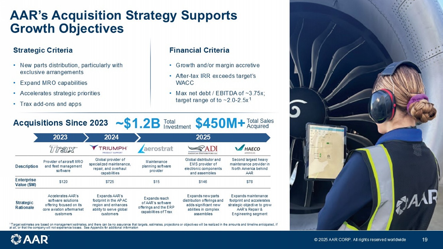 © 2025 AAR CORP. All rights reserved worldwide 18 Disciplined Balance Sheet Management and Capital Allocation Priorities Pro - Forma Adjusted Net Leverage Q3 FY24 Q4 FY24 Q1 FY25 Q2 FY25 Q3 FY25 Q4 FY25 Q1 FY26 3.2x 3.3 x 3.3 x 3.6x 3. 1x 2.7 x 2.5x 1 Target Pro - Forma Adj. Net Leverage Range 2.0x 2.5 x Successfully delevered in five quarters post Triumph acquisition (0.9 )x Maintain Flexible Balance Sheet 2 • Target Pro - Forma Adjusted Net Leverage ratio of ~2.0x – 2.5x • Max leverage ratio of ~3.75x EBITDA Organic Investment to Drive Growth • Support new business wins in Parts Supply • Strategic Airframe MRO expansion • Software and IP enabled offerings: Trax and PMA M&A • Disciplined adherence to strategic filters and financial criteria • Focused on core segments • Increase intellectual property in portfolio • Acquisitions of Aerostrat (Q1 FY26) and ADI and HAECO Americas (Q2 FY26) Return to Shareholders • Repurchased $108M of stock through FY25 with remaining authorization of $42M Capital Allocation Priorities Acquisitions of Acquisition of Note: See Appendix for reconciliation of Non - GAAP financial measures. 1 The pro forma adjusted net leverage ratio as of Q1 2026 is 2.8x, which is inclusive of the Aerostrat acquisition that closed on August 12, 2025. This column reflects a pro forma adjusted net leverage of 2.5 x, which is further adjusted to reflect the ADI and HAECO Americas acquisitions, which closed on September 25, 2025 and November 3, 2025, respectively, and thus will be reflected in the adjusted net leverage for Q2 2026. 2 Target estimates are based on management estimates, and there can be no assurance that targets, estimates, projections or objectives will be realized in the amounts and timeline anticipated, if at all, or that th e c ompany will not experience losses. See Appendix for additional information.