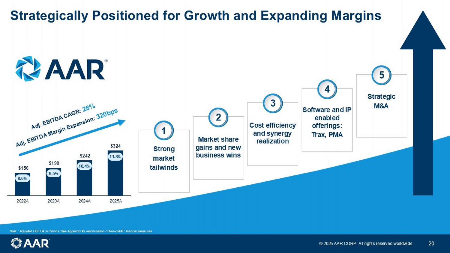 © 2025 AAR CORP. All rights reserved worldwide 19 AAR’s Acquisition Strategy Supports Growth Objectives Strategic Criteria • New parts distribution, particularly with exclusive arrangements • Expand MRO capabilities • Accelerates strategic priorities • Trax add - ons and apps Financial Criteria • Growth and/or margin accretive • After - tax IRR exceeds target’s WACC • Max net debt / EBITDA of ~3.75x; target range of to ~2.0 - 2.5x 1 Acquisitions Since 2023 Total Investment ~$1 .2 B Total Sales Acquired $450M+ 2023 2024 2025 Description 1 Target estimates are based on management estimates, and there can be no assurance that targets, estimates, projections or obj ect ives will be realized in the amounts and timeline anticipated, if at all, or that the company will not experience losses. See Appendix for additional information Strategic Rationale Accelerates AAR’s software solutions offering focused on its core aviation aftermarket customers Expands AAR’s footprint in the APAC region and enhances ability to serve global customers Expands reach of AAR’s software offerings and the ERP capabilities of Trax Expands new parts distribution offerings and adds significant new abilities in complex assemblies Expands maintenance footprint and accelerates strategic objective to grow AAR’s Repair & Engineering segment Provider of aircraft MRO and fleet management software Global provider of specialized maintenance, repair, and overhaul capabilities Global distributor and EMS provider of electronic components and assemblies Maintenance planning software provider Second largest heavy maintenance provider in North America behind AAR Enterprise Value ($M) $120 $725 $15 $146 $78
