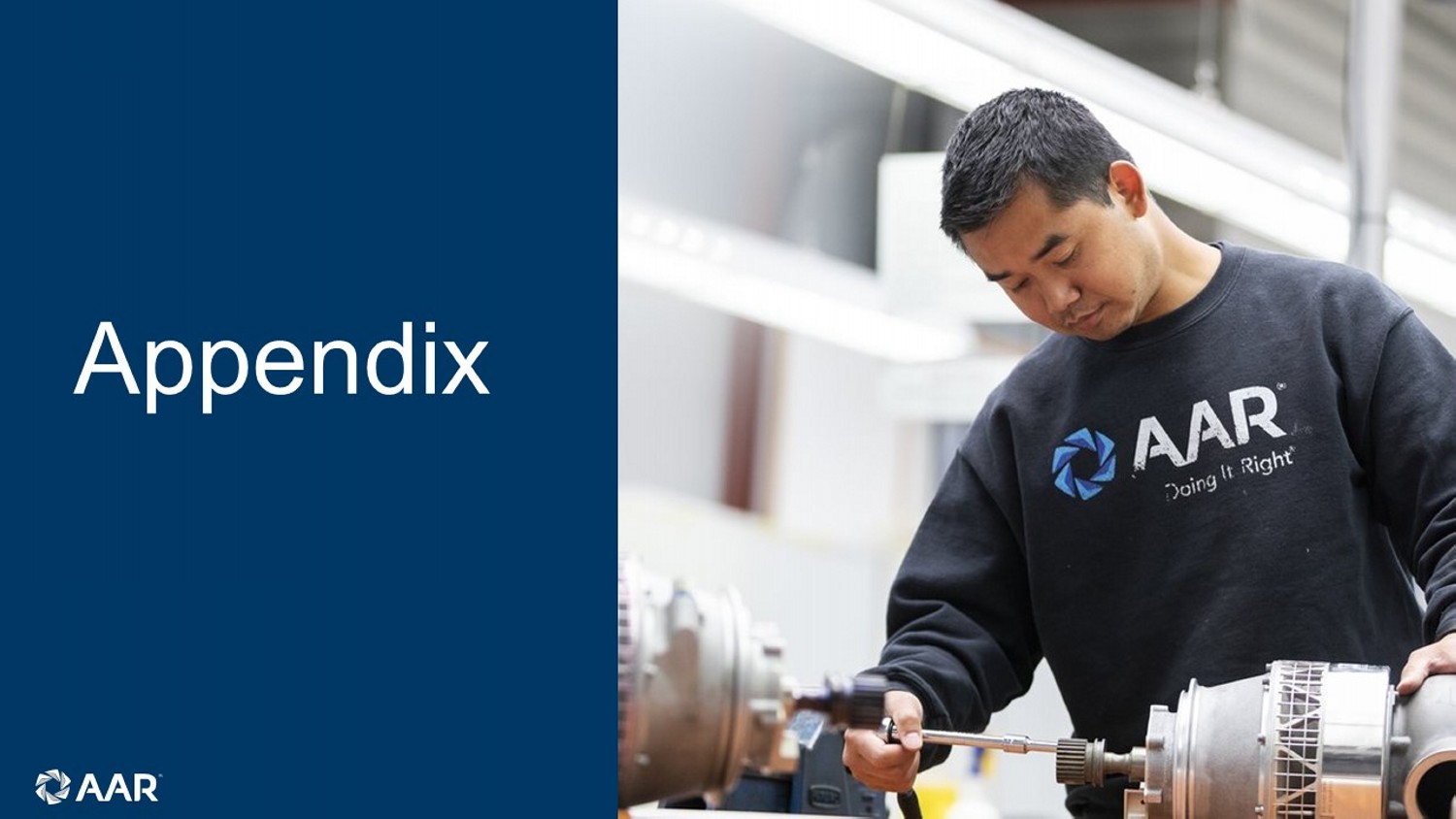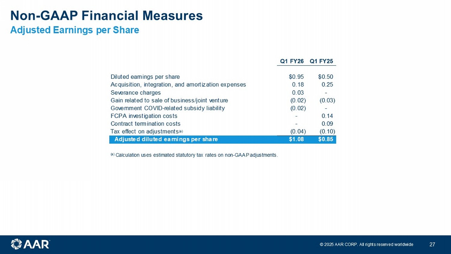 © 2025 AAR CORP. All rights reserved worldwide 26 Non - GAAP Financial Measures A djusted Sales, Operating Income, Operating Margin, EBITDA, and EBITDA Margin ($ in millions) Parts Supply Repair & Engineering Integrated Solutions Expeditionary Services Corporate & Other Consolidated Parts Supply Repair & Engineering Integrated Solutions Expeditionary Services Corporate & Other Consolidated Sales $317.8 $214.6 $185.0 $22.2 $0.0 $739.6 $249.7 $217.6 $168.9 $25.5 $0.0 $661.7 Operating income (loss) 40.9 20.4 9.7 3.0 (9.1) 64.9 30.1 21.1 7.7 (1.7) (13.8) 43.4 Operating income margin 12.9% 9.5% 5.2% 13.5% NA 8.8% 12.1% 9.7% 4.6% (6.7)% NA 6.6% Sales $317.8 $214.6 $185.0 $22.2 $0.0 $739.6 $249.7 $217.6 $168.9 $25.5 $0.0 $661.7 Contract termination costs - - - - - - - - - (9.5) - (9.5) Adjusted sales $317.8 $214.6 $185.0 $22.2 $0.0 $739.6 $249.7 $217.6 $168.9 $16.0 $0.0 $652.2 Operating income (loss) $40.9 $20.4 $9.7 $3.0 $(9.1) $64.9 $30.1 $21.1 $7.7 $(1.7) $(13.8) $43.4 Acquisition, integration & amortization expenses - 4.1 1.0 - 1.3 6.4 - 4.6 2.8 - 1.6 9.0 Severance charges - 0.4 0.3 - 0.3 1.0 - - - - - - Gain related to sale of business/joint venture, net - - - - - - - (1.4) - - - (1.4) Government COVID - related subsidy liability reversal - - - - (0.7) (0.7) - - - - - - Investigation costs - - - - - - - - - - 5.0 5.0 Contract termination costs - - - - - - - - - 3.2 - 3.2 Adjusted operating income $40.9 $24.9 $11.0 $3.0 $(8.2) $71.6 $30.1 $24.3 $10.5 $1.5 $(7.2) $59.2 Adjusted operating margin 12.9% 11.6% 5.9% 13.5% NA 9.7% 12.1% 11.2% 6.2% 9.4% NA 9.1% Operating income (loss) $40.9 $20.4 $9.7 $3.0 $(9.1) $64.9 $30.1 $21.1 $7.7 $(1.7) $(13.8) $43.4 Depreciation and amortization 2.2 6.1 4.0 0.4 1.1 13.8 2.1 6.2 3.7 0.4 1.1 13.5 Stock - based compensation 0.7 0.5 0.5 - 3.6 5.3 0.5 0.4 0.3 - 3.8 5.0 Acquisition and integration expenses - 1.1 - - 1.3 2.4 - 1.6 1.8 - 1.6 5.0 Severance Charges - 0.4 0.3 - 0.3 1.0 - - - - - - Government COVID - related subsidy liability reversal - - - - (0.7) (0.7) - - - - - - Investigation costs - - - - - - - - - - 5.0 5.0 Contract termination costs - - - - - - - - - 3.2 - 3.2 Gain related to sale of joint venture - - - - - - - (1.4) - - - (1.4) Adjusted EBITDA $43.8 $28.5 $14.5 $3.4 $(3.5) $86.7 $32.7 $27.9 $13.5 $1.9 $(2.3) $73.7 Adjusted EBITDA margin 13.8% 13.3% 7.8% 15.3% NA 11.7% 13.1% 12.8% 8.0% 11.9% NA 11.3% Q1 FY26 Q1 FY25