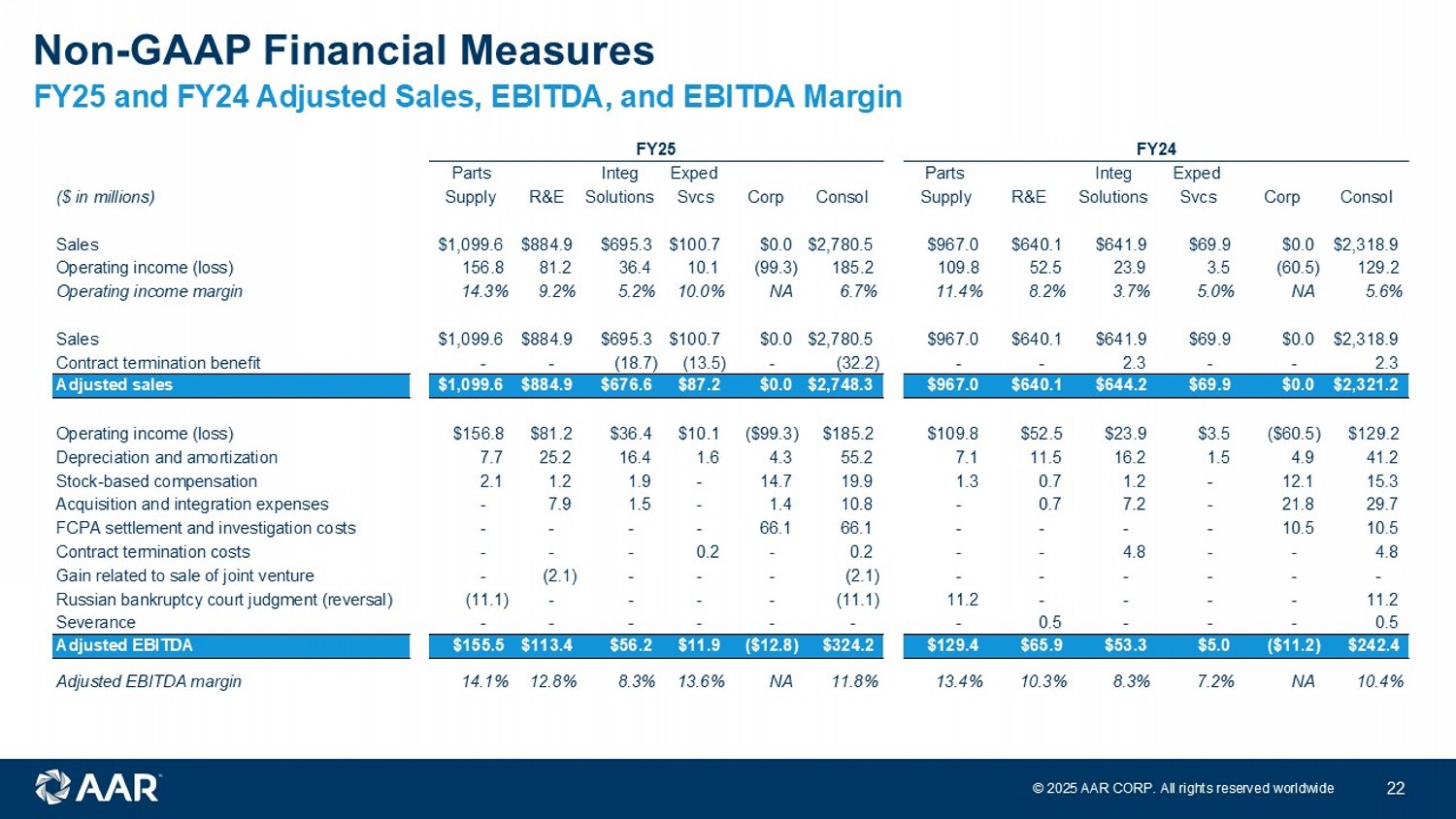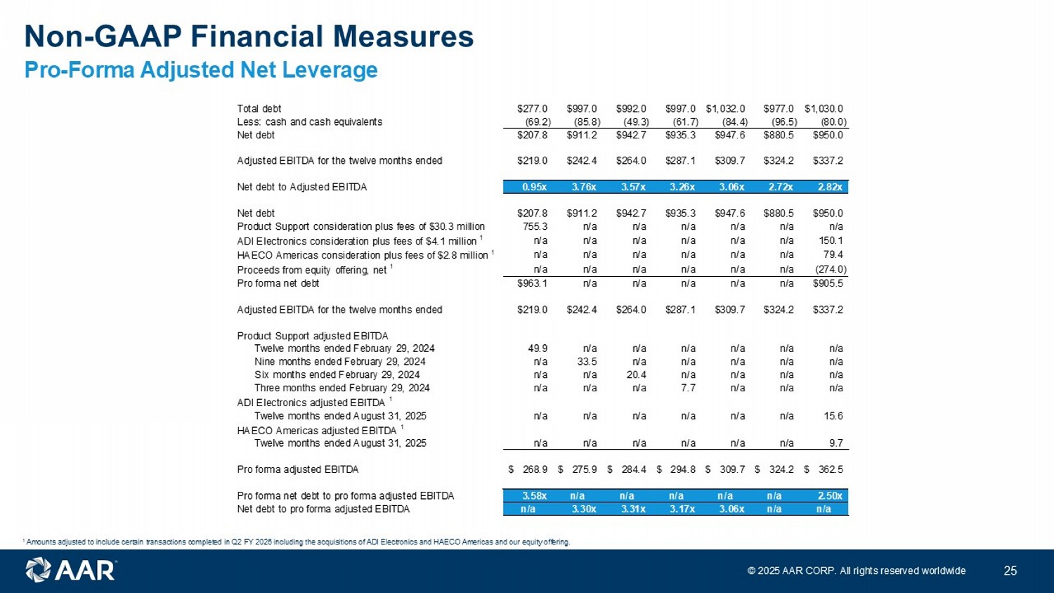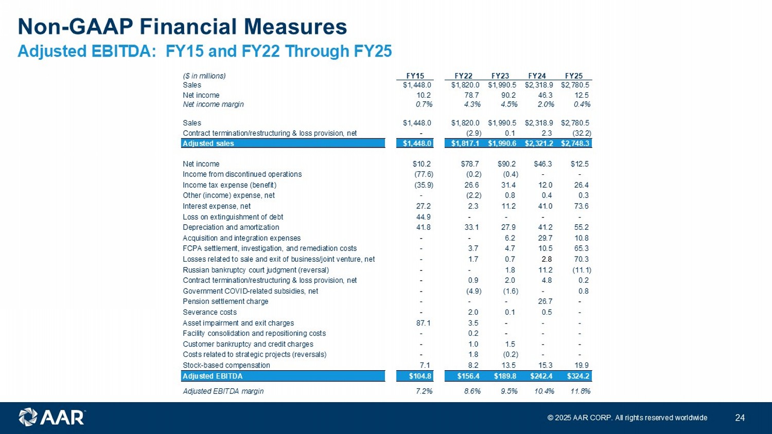 © 2025 AAR CORP. All rights reserved worldwide 24 Adjusted EBITDA: FY15 and FY22 Through FY25 Non - GAAP Financial Measures ($ in millions) FY15 FY22 FY23 FY24 FY25 Sales $1,448.0 $1,820.0 $1,990.5 $2,318.9 $2,780.5 Net income 10.2 78.7 90.2 46.3 12.5 Net income margin 0.7% 4.3% 4.5% 2.0% 0.4% Sales $1,448.0 $1,820.0 $1,990.5 $2,318.9 $2,780.5 Contract termination/restructuring & loss provision, net - (2.9) 0.1 2.3 (32.2) Adjusted sales $1,448.0 $1,817.1 $1,990.6 $2,321.2 $2,748.3 Net income $10.2 $78.7 $90.2 $46.3 $12.5 Income from discontinued operations (77.6) (0.2) (0.4) - - Income tax expense (benefit) (35.9) 26.6 31.4 12.0 26.4 Other (income) expense, net - (2.2) 0.8 0.4 0.3 Interest expense, net 27.2 2.3 11.2 41.0 73.6 Loss on extinguishment of debt 44.9 - - - - Depreciation and amortization 41.8 33.1 27.9 41.2 55.2 Acquisition and integration expenses - - 6.2 29.7 10.8 FCPA settlement, investigation, and remediation costs - 3.7 4.7 10.5 65.3 Losses related to sale and exit of business/joint venture, net - 1.7 0.7 2.8 70.3 Russian bankruptcy court judgment (reversal) - - 1.8 11.2 (11.1) Contract termination/restructuring & loss provision, net - 0.9 2.0 4.8 0.2 Government COVID - related subsidies, net - (4.9) (1.6) - 0.8 Pension settlement charge - - - 26.7 - Severance costs - 2.0 0.1 0.5 - Asset impairment and exit charges 87.1 3.5 - - - Facility consolidation and repositioning costs - 0.2 - - - Customer bankruptcy and credit charges - 1.0 1.5 - - Costs related to strategic projects (reversals) - 1.8 (0.2) - - Stock - based compensation 7.1 8.2 13.5 15.3 19.9 Adjusted EBITDA $104.8 $156.4 $189.8 $242.4 $324.2 Adjusted EBITDA margin 7.2% 8.6% 9.5% 10.4% 11.8%