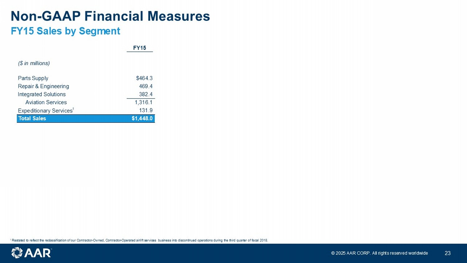 © 2025 AAR CORP. All rights reserved worldwide 22 FY25 and FY24 Adjusted Sales, EBITDA, and EBITDA Margin Non - GAAP Financial Measures FY25 FY24 Parts Integ Exped Parts Integ Exped ($ in millions) Supply R&E Solutions Svcs Corp Consol Supply R&E Solutions Svcs Corp Consol Sales $1,099.6 $884.9 $695.3 $100.7 $0.0 $2,780.5 $967.0 $640.1 $641.9 $69.9 $0.0 $2,318.9 Operating income (loss) 156.8 81.2 36.4 10.1 (99.3) 185.2 109.8 52.5 23.9 3.5 (60.5) 129.2 Operating income margin 14.3% 9.2% 5.2% 10.0% NA 6.7% 11.4% 8.2% 3.7% 5.0% NA 5.6% Sales $1,099.6 $884.9 $695.3 $100.7 $0.0 $2,780.5 $967.0 $640.1 $641.9 $69.9 $0.0 $2,318.9 Contract termination benefit - - (18.7) (13.5) - (32.2) - - 2.3 - - 2.3 Adjusted sales $1,099.6 $884.9 $676.6 $87.2 $0.0 $2,748.3 $967.0 $640.1 $644.2 $69.9 $0.0 $2,321.2 Operating income (loss) $156.8 $81.2 $36.4 $10.1 ($99.3) $185.2 $109.8 $52.5 $23.9 $3.5 ($60.5) $129.2 Depreciation and amortization 7.7 25.2 16.4 1.6 4.3 55.2 7.1 11.5 16.2 1.5 4.9 41.2 Stock - based compensation 2.1 1.2 1.9 - 14.7 19.9 1.3 0.7 1.2 - 12.1 15.3 Acquisition and integration expenses - 7.9 1.5 - 1.4 10.8 - 0.7 7.2 - 21.8 29.7 FCPA settlement and investigation costs - - - - 66.1 66.1 - - - - 10.5 10.5 Contract termination costs - - - 0.2 - 0.2 - - 4.8 - - 4.8 Gain related to sale of joint venture - (2.1) - - - (2.1) - - - - - - Russian bankruptcy court judgment (reversal) (11.1) - - - - (11.1) 11.2 - - - - 11.2 Severance - - - - - - - 0.5 - - - 0.5 Adjusted EBITDA $155.5 $113.4 $56.2 $11.9 ($12.8) $324.2 $129.4 $65.9 $53.3 $5.0 ($11.2) $242.4 Adjusted EBITDA margin 14.1% 12.8% 8.3% 13.6% NA 11.8% 13.4% 10.3% 8.3% 7.2% NA 10.4%