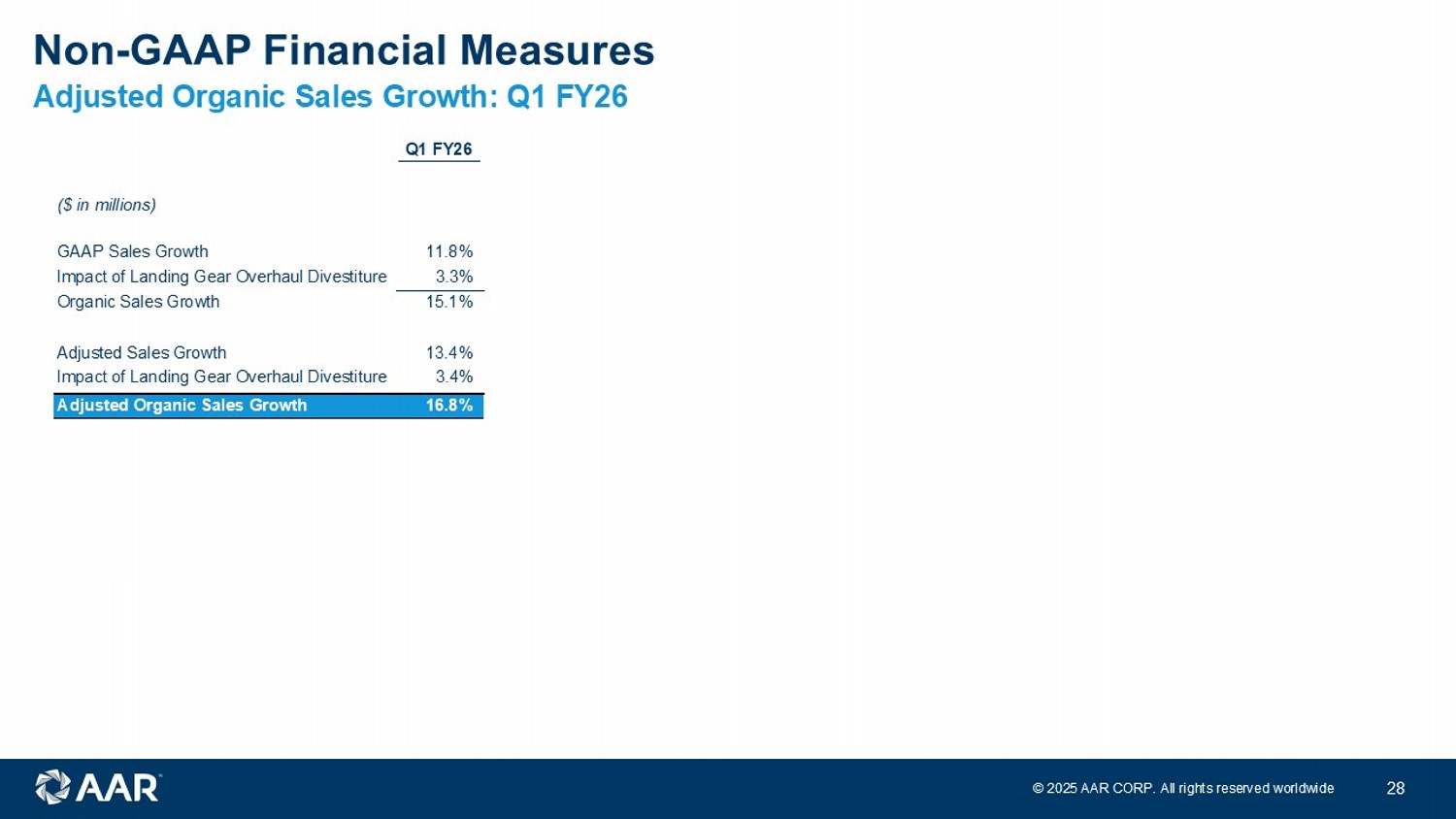 © 2025 AAR CORP. All rights reserved worldwide 27 Non - GAAP Financial Measures A djusted Earnings per Share Q1 FY26 Q1 FY25 Diluted earnings per share $0.95 $0.50 Acquisition, integration, and amortization expenses 0.18 0.25 Severance charges 0.03 - Gain related to sale of business/joint venture (0.02) (0.03) Government COVID-related subsidy liability (0.02) - FCPA investigation costs - 0.14 Contract termination costs - 0.09 Tax effect on adjustments (a) (0.04) (0.10) Adjusted diluted earnings per share $1.08 $0.85 (a) Calculation uses estimated statutory tax rates on non-GAAP adjustments.