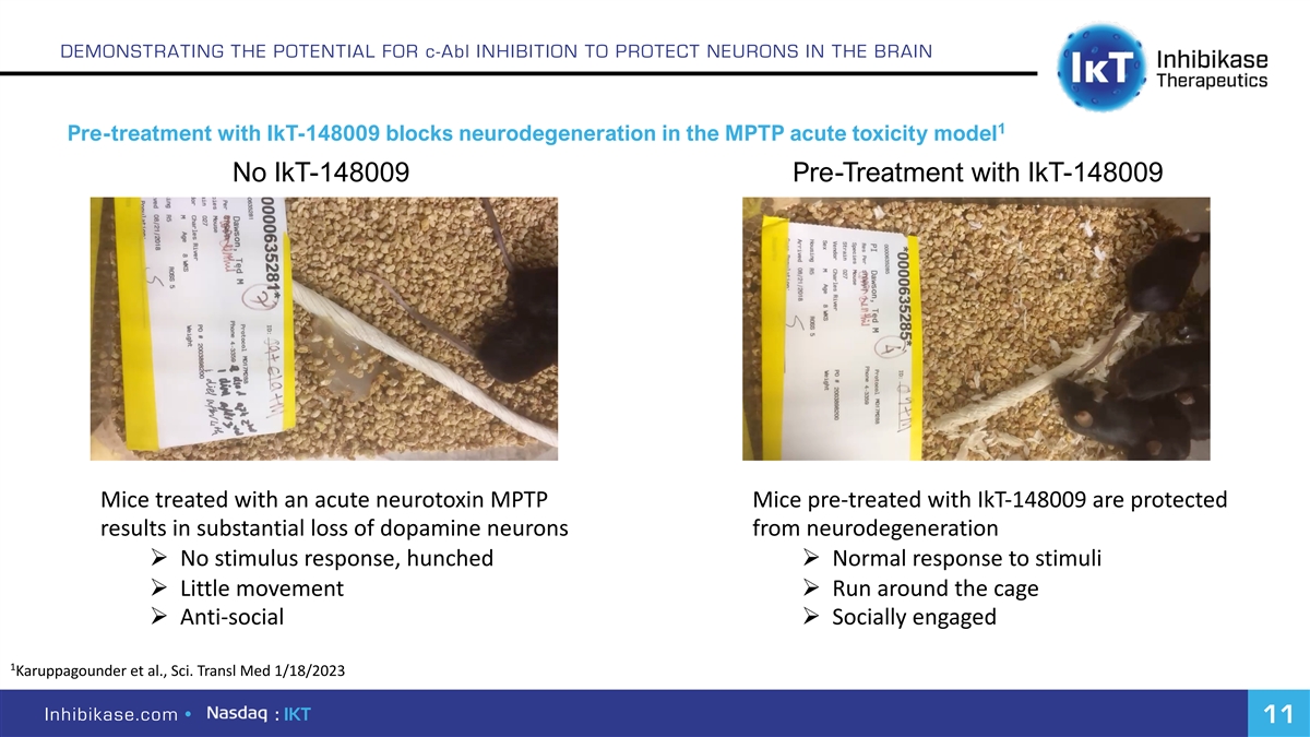 DEMONSTRATING THE POTENTIAL FOR c-Abl INHIBITION TO PROTECT NEURONS IN THE BRAIN 1 Pre-treatment with IkT-148009 blocks neurodegeneration in the MPTP acute toxicity model No IkT-148009 Pre-Treatment with IkT-148009 Mice treated with an acute neurotoxin MPTP Mice pre-treated with IkT-148009 are protected results in substantial loss of dopamine neurons from neurodegeneration Ø No stimulus response, hunched Ø Normal response to stimuli Ø Little movement Ø Run around the cage Ø Anti-social Ø Socially engaged 1 Karuppagounder et al., Sci. Transl Med 1/18/2023 Inhibikase.com • : IKT 11