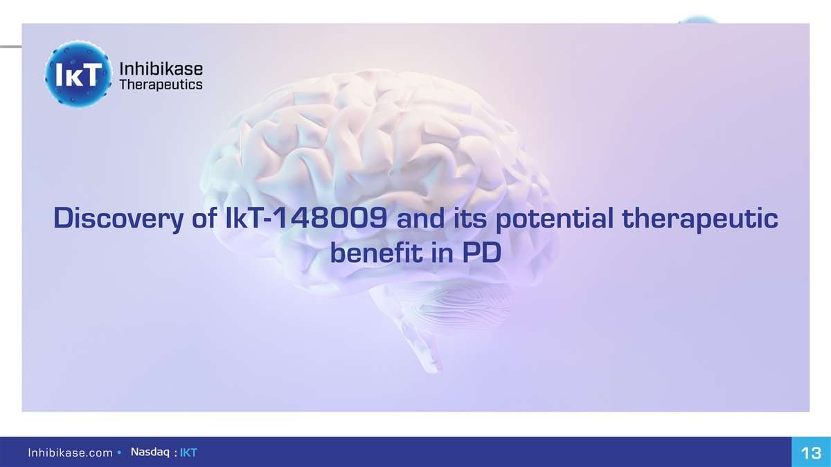 Initial conclusions What we concluded early on about c-Abl inhibition as a potential 1 disease-modifying therapy for PD? Ø C-Abl is an essential determinant for PD initiation and progression: If you delete the gene, you cannot induce neurodegeneration in animals Ø C-Abl inhibition can block induction of neurodegeneration by the acute neurotoxin MPTP 1 Werner and Olanow, Mov. Disord. 2022 DOI: 10.1002/mds.28858 Inhibikase.com • : IKT 12