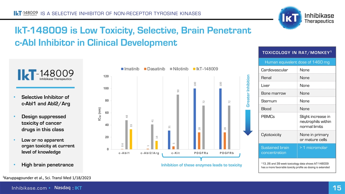 IS A SELECTIVE INHIBITOR OF NON-RECEPTOR TYROSINE KINASES IkT-148009 is Low Toxicity, Selective, Brain Penetrant c-Abl Inhibitor in Clinical Development 1 TOXICOLOGY IN RAT/MONKEY Human equivalent dose of 1460 mg Imatinib Dasatinib Nilotinib IkT-148009 Cardiovascular None 120 Renal None Liver None 100 Bone marrow None • Selective Inhibitor of 80 Sternum None c-Abl1 and Abl2/Arg Blood None 60 PBMCs Slight increase in • Design suppressed neutrophils within toxicity of cancer 40 normal limits drugs in this class Cytotoxicity None in primary 20 or mature cells • Low or no apparent organ toxicity at current Sustained brain > 1 micromolar 0 level of knowledge c-Abl1 c-Abl2/Arg c-Kit PDGFRa PDGFRb concentration 1 13, 26 and 39 week toxicology data shows IkT-148009 • High brain penetrance Inhibition of these enzymes leads to toxicity has a more favorable toxicity profile as dosing is extended 1 Karuppagounder et al., Sci. Transl Med 1/18/2023 Inhibikase.com • : IKT 15 IC (nm) 50 0.6 48 33 1 41 14 31 5 90 100 28 72 100 28 72 Greater Inhibition