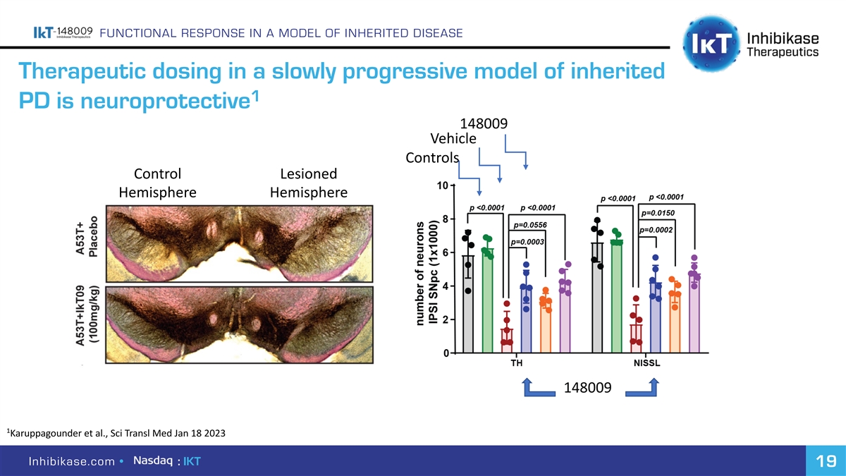 FUNCTIONAL RESPONSE IN A MODEL OF INHERITED DISEASE Therapeutic dosing in a slowly progressive model of inherited 1 PD is neuroprotective 148009 Vehicle Controls Control Lesioned Hemisphere Hemisphere 148009 1 Karuppagounder et al., Sci Transl Med Jan 18 2023 Inhibikase.com • : IKT 19