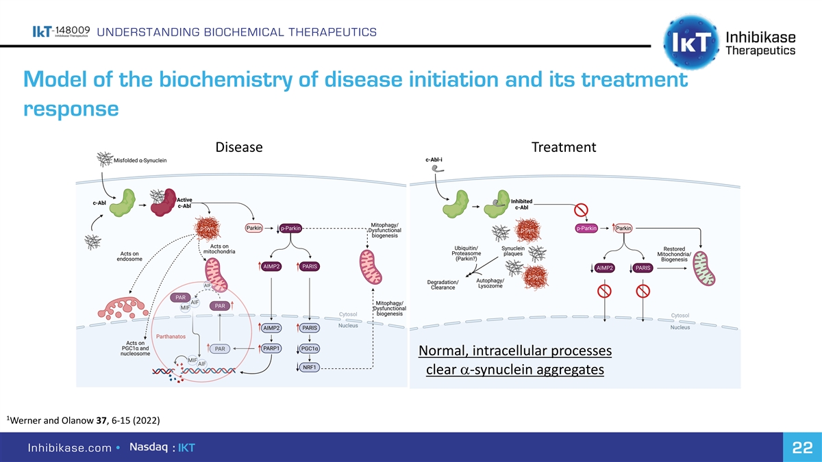 UNDERSTANDING BIOCHEMICAL THERAPEUTICS Model of the biochemistry of disease initiation and its treatment response Disease Treatment Normal, intracellular processes clear a-synuclein aggregates 1 Werner and Olanow37, 6-15 (2022) Inhibikase.com • : IKT 22