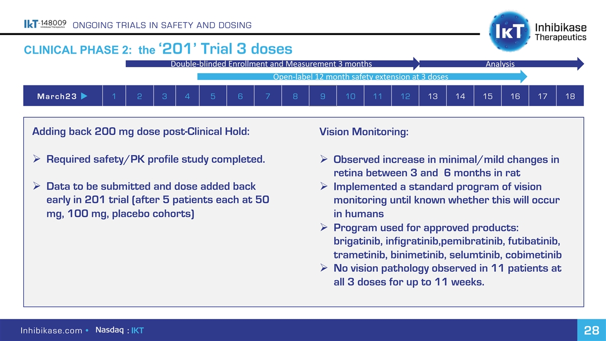 ONGOING TRIALS IN SAFETY AND DOSING CLINICAL PHASE 2: the ‘201’ Trial 3 doses Double-blinded Enrollment and Measurement 3 months Analysis Open-label 12 month safety extension at 3 doses March23 u 1 2 3 4 5 6 7 8 9 10 11 12 13 14 15 16 17 18 Adding back 200 mg dose post-Clinical Hold: Vision Monitoring: Ø Required safety/PK profile study completed. Ø Observed increase in minimal/mild changes in retina between 3 and 6 months in rat Ø Data to be submitted and dose added back Ø Implemented a standard program of vision early in 201 trial (after 5 patients each at 50 monitoring until known whether this will occur mg, 100 mg, placebo cohorts) in humans Ø Program used for approved products: brigatinib, infigratinib,pemibratinib, futibatinib, trametinib, binimetinib, selumtinib, cobimetinib Ø No vision pathology observed in 11 patients at all 3 doses for up to 11 weeks. Inhibikase.com • : IKT 28