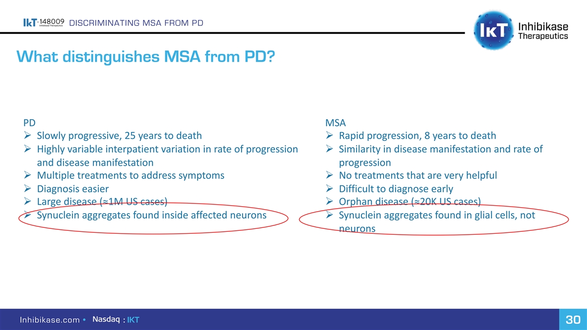 DISCRIMINATING MSA FROM PD What distinguishes MSA from PD? PD MSA Ø Slowly progressive, 25 years to death Ø Rapid progression, 8 years to death Ø Highly variable interpatient variation in rate of progression Ø Similarity in disease manifestation and rate of and disease manifestation progression Ø Multiple treatments to address symptoms Ø No treatments that are very helpful Ø Diagnosis easier Ø Difficult to diagnose early Ø Large disease (≈1M US cases) Ø Orphan disease (≈20K US cases) Ø Synuclein aggregates found inside affected neurons Ø Synuclein aggregates found in glial cells, not neurons Inhibikase.com • : IKT 30