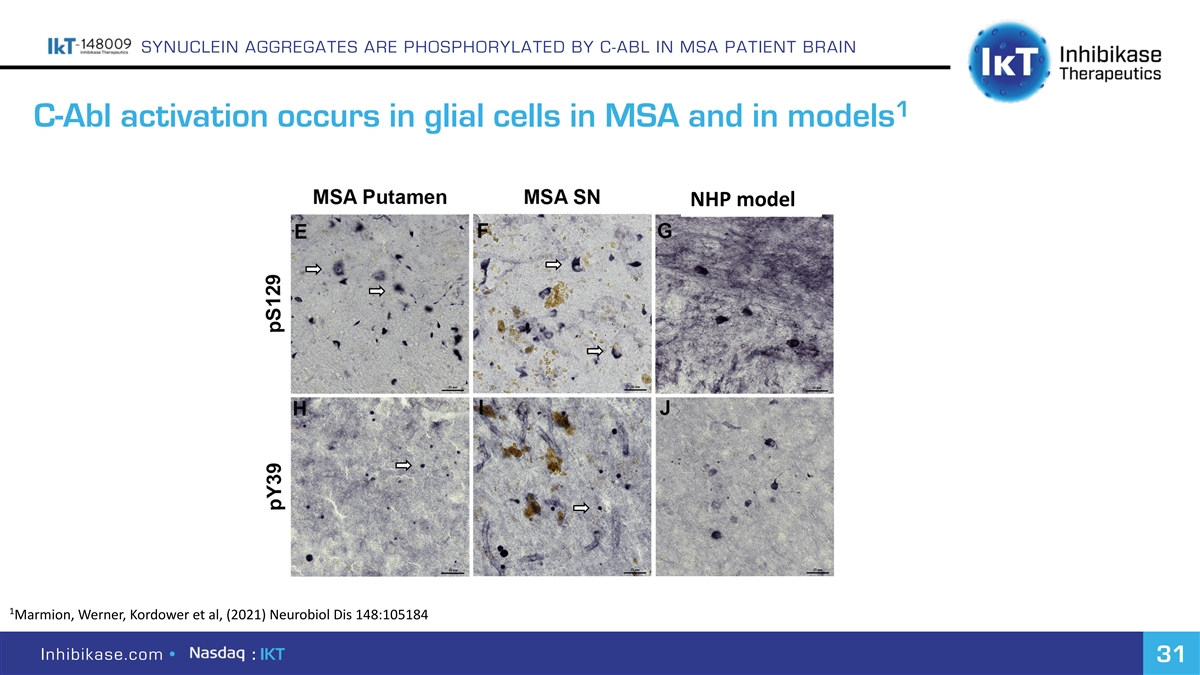 SYNUCLEIN AGGREGATES ARE PHOSPHORYLATED BY C-ABL IN MSA PATIENT BRAIN 1 C-Abl activation occurs in glial cells in MSA and in models NHP model 1 Marmion, Werner, Kordower et al, (2021) Neurobiol Dis 148:105184 Inhibikase.com • : IKT 31
