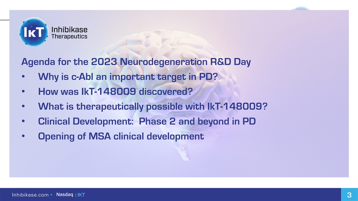Agenda for the 2023 Neurodegeneration R&D Day • Why is c-Abl an important target in PD? • How was IkT-148009 discovered? • What is therapeutically possible with IkT-148009? • Clinical Development: Phase 2 and beyond in PD • Opening of MSA clinical development In Inh hiib biik ka as se e.c .co om m • • :: IK IKT T 3 3