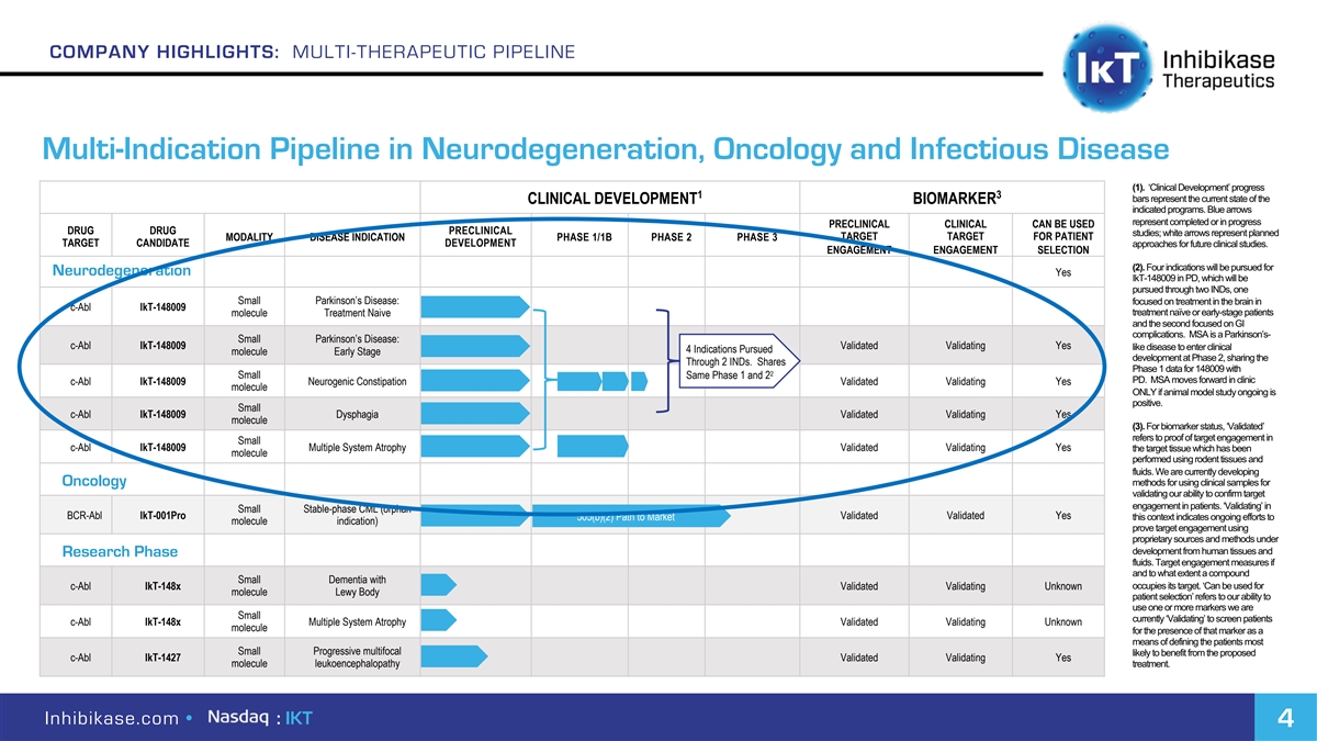 COMPANY HIGHLIGHTS: MULTI-THERAPEUTIC PIPELINE Multi-Indication Pipeline in Neurodegeneration, Oncology and Infectious Disease (1). ‘Clinical Development’ progress 1 3 bars represent the current state of the CLINICAL DEVELOPMENT BIOMARKER indicated programs. Blue arrows represent completed or in progress PRECLINICAL CLINICAL CAN BE USED DRUG DRUG PRECLINICAL studies; white arrows represent planned TARGET TARGET FOR PATIENT MODALITY DISEASE INDICATION PHASE 1/1B PHASE 2 PHASE 3 TARGET CANDIDATE DEVELOPMENT approaches for future clinical studies. ENGAGEMENT ENGAGEMENT SELECTION (2). Four indications will be pursued for Neurodegeneration Yes IkT-148009 in PD, which will be pursued through two INDs, one Small Parkinson’s Disease: focused on treatment in the brain in c-Abl IkT-148009 treatment naïve or early-stage patients molecule Treatment Naive and the second focused on GI complications. MSA is a Parkinson’s- Small Parkinson’s Disease: c-Abl IkT-148009 Validated Validating Yes like disease to enter clinical 4 Indications Pursued molecule Early Stage development at Phase 2, sharing the Through 2 INDs. Shares Phase 1 data for 148009 with 2 Small Same Phase 1 and 2 PD. MSA moves forward in clinic c-Abl IkT-148009 Neurogenic Constipation Validated Validating Yes molecule ONLY if animal model study ongoing is positive. Small c-Abl IkT-148009 Dysphagia Validated Validating Yes molecule (3). For biomarker status, ‘Validated’ refers to proof of target engagement in Small c-Abl IkT-148009 Multiple System Atrophy Validated Validating Yes the target tissue which has been molecule performed using rodent tissues and fluids. We are currently developing Oncology methods for using clinical samples for validating our ability to confirm target engagement in patients. ‘Validating’ in Small Stable-phase CML (orphan BCR-Abl IkT-001Pro 505(b)(2) Path to Market Validated Validated Yes this context indicates ongoing efforts to molecule indication) prove target engagement using proprietary sources and methods under development from human tissues and Research Phase fluids. Target engagement measures if and to what extent a compound Small Dementia with occupies its target. ‘Can be used for c-Abl IkT-148x Validated Validating Unknown molecule Lewy Body patient selection’ refers to our ability to use one or more markers we are Small currently ‘Validating’ to screen patients c-Abl IkT-148x Multiple System Atrophy Validated Validating Unknown molecule for the presence of that marker as a means of defining the patients most Small Progressive multifocal likely to benefit from the proposed c-Abl IkT-1427 Validated Validating Yes molecule leukoencephalopathy treatment. Inhibikase.com • : IKT 4