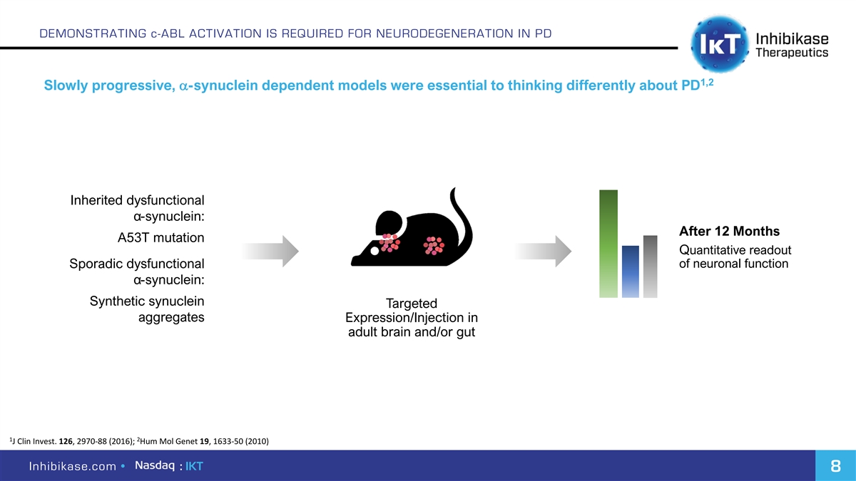 DEMONSTRATING c-ABL ACTIVATION IS REQUIRED FOR NEURODEGENERATION IN PD 1,2 Slowly progressive, a-synuclein dependent models were essential to thinking differently about PD Inherited dysfunctional α-synuclein: After 12 Months A53T mutation Quantitative readout Sporadic dysfunctional of neuronal function α-synuclein: Synthetic synuclein Targeted aggregates Expression/Injection in adult brain and/or gut 1 2 J Clin Invest. 126, 2970-88 (2016); Hum Mol Genet 19, 1633-50 (2010) Inhibikase.com • : IKT 8