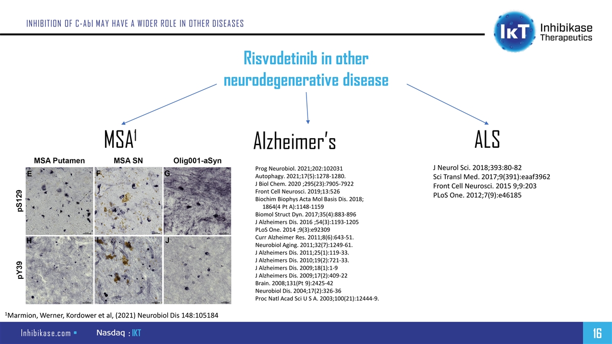 INHIBITION OF C-Abl MAY HAVE A WIDER ROLE IN OTHER DISEASES Risvodetinib in other neurodegenerative disease 1 MSA ALS Alzheimer’s J Neurol Sci. 2018;393:80-82 Prog Neurobiol. 2021;202:102031 Autophagy. 2021;17(5):1278-1280. Sci Transl Med. 2017;9(391):eaaf3962 J Biol Chem. 2020 ;295(23):7905-7922 Front Cell Neurosci. 2015 9;9:203 Front Cell Neurosci. 2019;13:526 PLoS One. 2012;7(9):e46185 Biochim Biophys Acta Mol Basis Dis. 2018; 1864(4 Pt A):1148-1159 Biomol Struct Dyn. 2017;35(4):883-896 J Alzheimers Dis. 2016 ;54(3):1193-1205 PLoS One. 2014 ;9(3):e92309 Curr Alzheimer Res. 2011;8(6):643-51. Neurobiol Aging. 2011;32(7):1249-61. J Alzheimers Dis. 2011;25(1):119-33. J Alzheimers Dis. 2010;19(2):721-33. J Alzheimers Dis. 2009;18(1):1-9 J Alzheimers Dis. 2009;17(2):409-22 Brain. 2008;131(Pt 9):2425-42 Neurobiol Dis. 2004;17(2):326-36 Proc Natl Acad Sci U S A. 2003;100(21):12444-9. 1 Marmion, Werner, Kordower et al, (2021) Neurobiol Dis 148:105184 Inhibikase.com • : IKT 16