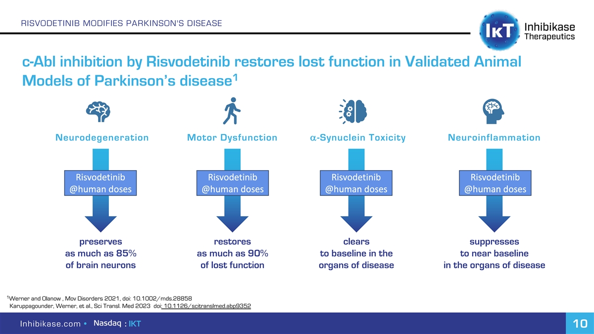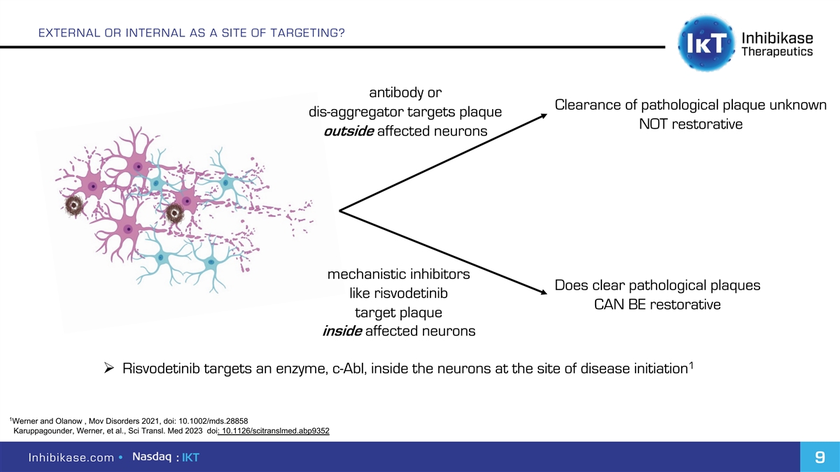 EXTERNAL OR INTERNAL AS A SITE OF TARGETING? antibody or Clearance of pathological plaque unknown dis-aggregator targets plaque NOT restorative outside affected neurons mechanistic inhibitors Does clear pathological plaques like risvodetinib CAN BE restorative target plaque inside affected neurons 1 Ø Risvodetinib targets an enzyme, c-Abl, inside the neurons at the site of disease initiation 1 Werner and Olanow , Mov Disorders 2021, doi: 10.1002/mds.28858 Karuppagounder, Werner, et al., Sci Transl. Med 2023 doi: 10.1126/scitranslmed.abp9352 Inhibikase.com • : IKT 9
