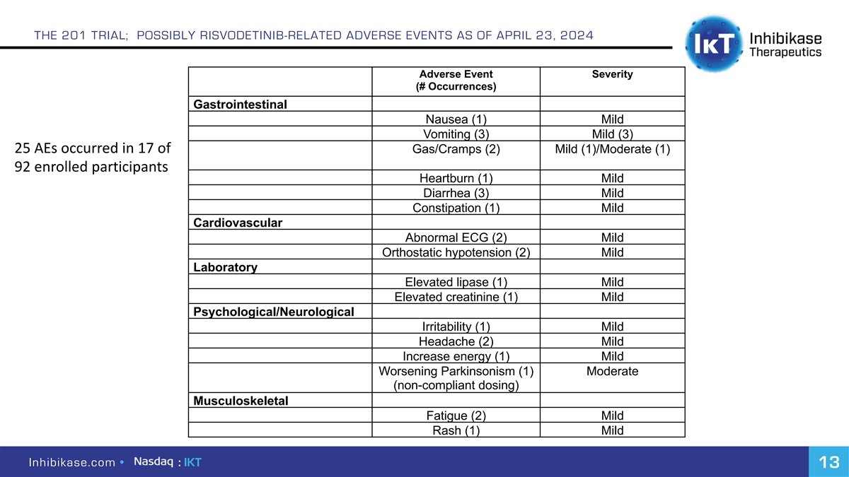 THE 201 TRIAL; POSSIBLY RISVODETINIB-RELATED ADVERSE EVENTS AS OF APRIL 23, 2024 Adverse Event Severity (# Occurrences) Gastrointestinal Nausea (1) Mild Vomiting (3) Mild (3) 25 AEs occurred in 17 of Gas/Cramps (2) Mild (1)/Moderate (1) 92 enrolled participants Heartburn (1) Mild Diarrhea (3) Mild Constipation (1) Mild Cardiovascular Abnormal ECG (2) Mild Orthostatic hypotension (2) Mild Laboratory Elevated lipase (1) Mild Elevated creatinine (1) Mild Psychological/Neurological Irritability (1) Mild Headache (2) Mild Increase energy (1) Mild Worsening Parkinsonism (1) Moderate (non-compliant dosing) Musculoskeletal Fatigue (2) Mild Rash (1) Mild Inhibikase.com • : IKT 13