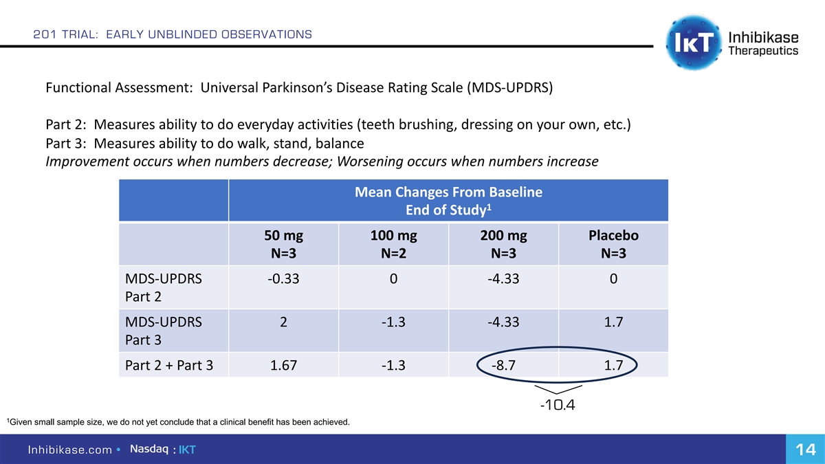 201 TRIAL: EARLY UNBLINDED OBSERVATIONS Functional Assessment: Universal Parkinson’s Disease Rating Scale (MDS-UPDRS) Part 2: Measures ability to do everyday activities (teeth brushing, dressing on your own, etc.) Part 3: Measures ability to do walk, stand, balance Improvement occurs when numbers decrease; Worsening occurs when numbers increase Mean Changes From Baseline 1 End of Study 50 mg 100 mg 200 mg Placebo N=3 N=2 N=3 N=3 MDS-UPDRS -0.33 0 -4.33 0 Part 2 MDS-UPDRS 2 -1.3 -4.33 1.7 Part 3 Part 2 + Part 3 1.67 -1.3 -8.7 1.7 -10.4 1 Given small sample size, we do not yet conclude that a clinical benefit has been achieved. Inhibikase.com • : IKT 14