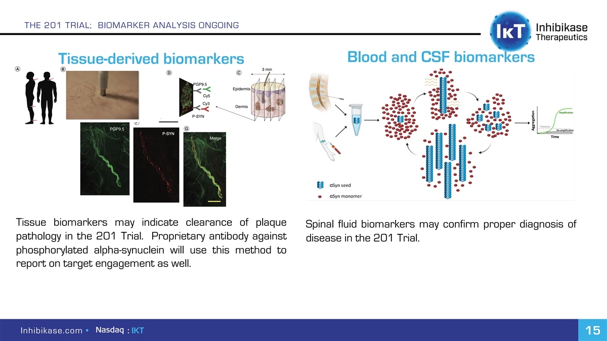 THE 201 TRIAL; BIOMARKER ANALYSIS ONGOING Blood and CSF biomarkers Tissue-derived biomarkers Tissue biomarkers may indicate clearance of plaque Spinal fluid biomarkers may confirm proper diagnosis of pathology in the 201 Trial. Proprietary antibody against disease in the 201 Trial. phosphorylated alpha-synuclein will use this method to report on target engagement as well. Inhibikase.com • : IKT 15