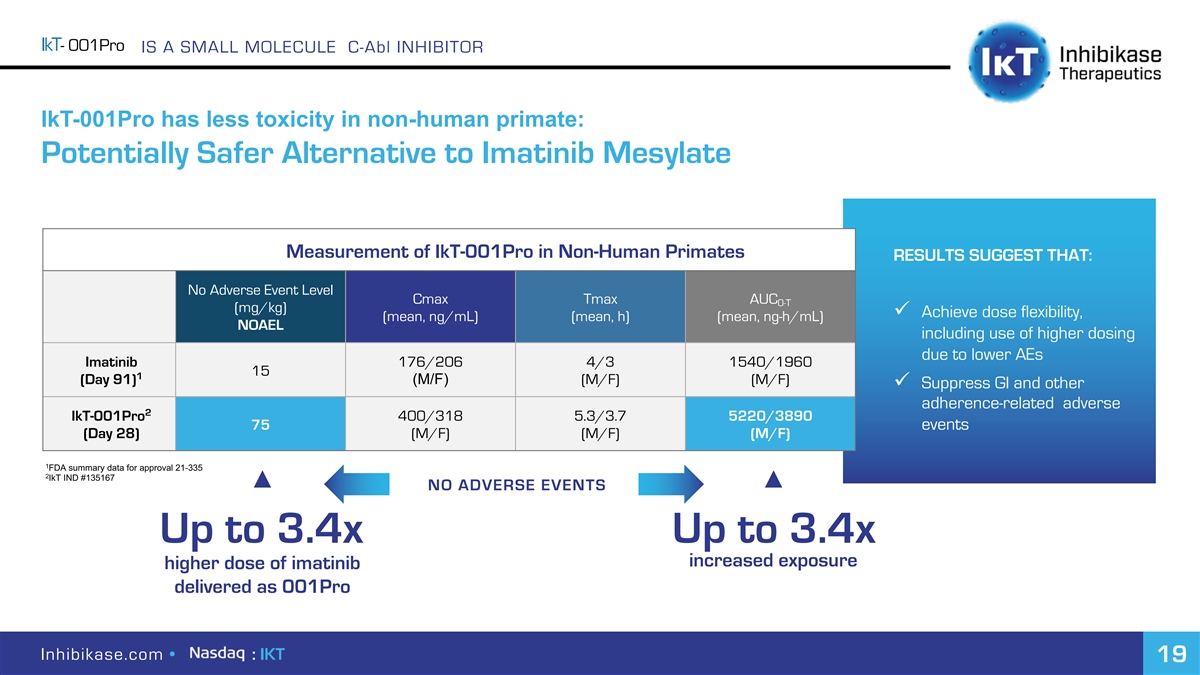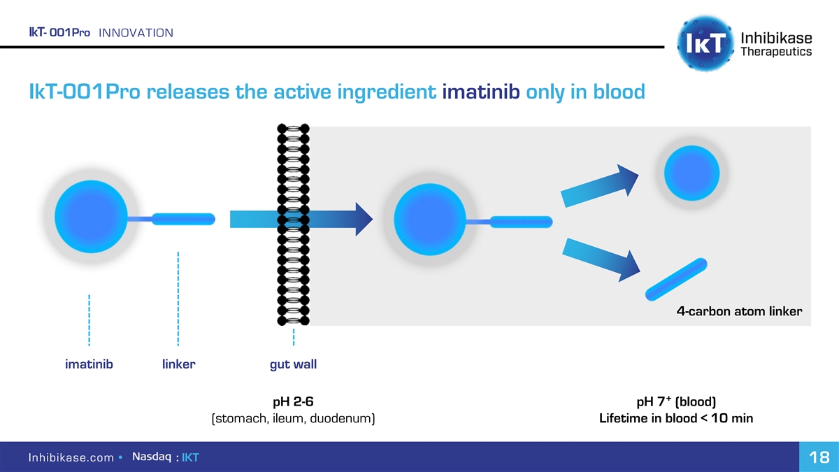 IkT- 001Pro INNOVATION IkT-001Pro releases the active ingredient imatinib only in blood 4-carbon atom linker imatinib linker gut wall + pH 2-6 pH 7 (blood) (stomach, ileum, duodenum) Lifetime in blood < 10 min Inhibikase.com • : IKT 18
