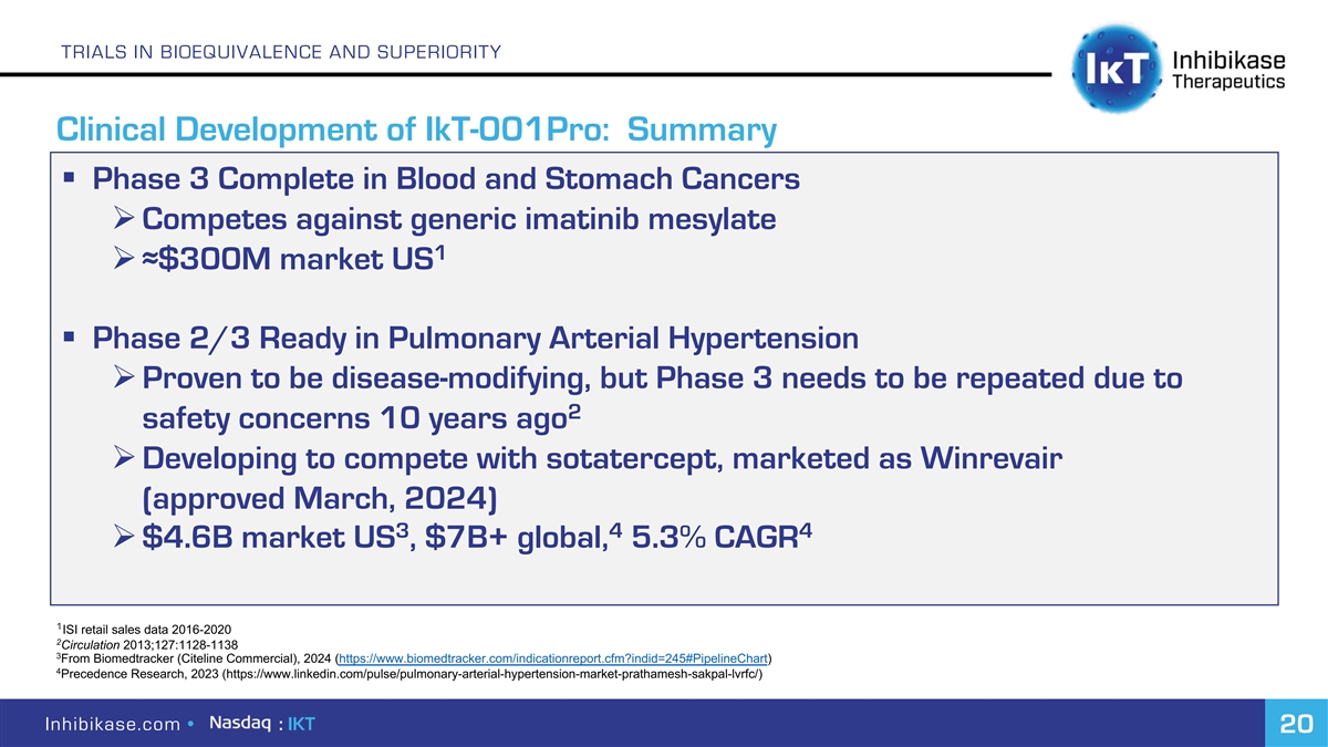 TRIALS IN BIOEQUIVALENCE AND SUPERIORITY Clinical Development of IkT-001Pro: Summary § Phase 3 Complete in Blood and Stomach Cancers Ø Competes against generic imatinib mesylate 1 Ø≈$300M market US § Phase 2/3 Ready in Pulmonary Arterial Hypertension Ø Proven to be disease-modifying, but Phase 3 needs to be repeated due to 2 safety concerns 10 years ago Ø Developing to compete with sotatercept, marketed as Winrevair (approved March, 2024) 3 4 4 Ø $4.6B market US , $7B+ global, 5.3% CAGR 1 ISI retail sales data 2016-2020 2 Circulation 2013;127:1128-1138 3 From Biomedtracker (Citeline Commercial), 2024 (https://www.biomedtracker.com/indicationreport.cfm?indid=245#PipelineChart) 4 Precedence Research, 2023 (https://www.linkedin.com/pulse/pulmonary-arterial-hypertension-market-prathamesh-sakpal-lvrfc/) Inhibikase.com • : IKT 20