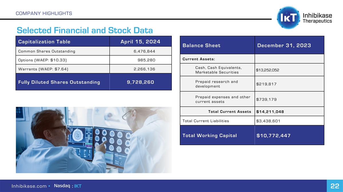 COMPANY HIGHLIGHTS Selected Financial and Stock Data Capitalization Table April 15, 2024 Balance Sheet December 31, 2023 Common Shares Outstanding 6,476,844 Current Assets: Options (WAEP: $10.33) 985,280 Cash, Cash Equivalents, Warrants (WAEP: $7.64) 2,266,136 $13,252,052 Marketable Securities Prepaid research and Fully Diluted Shares Outstanding 9,728,260 $219,817 development Prepaid expenses and other $739,179 current assets Total Current Assets $14,211,048 Total Current Liabilities $3,438,601 Total Working Capital $10,772,447 Inhibikase.com • : IKT 22