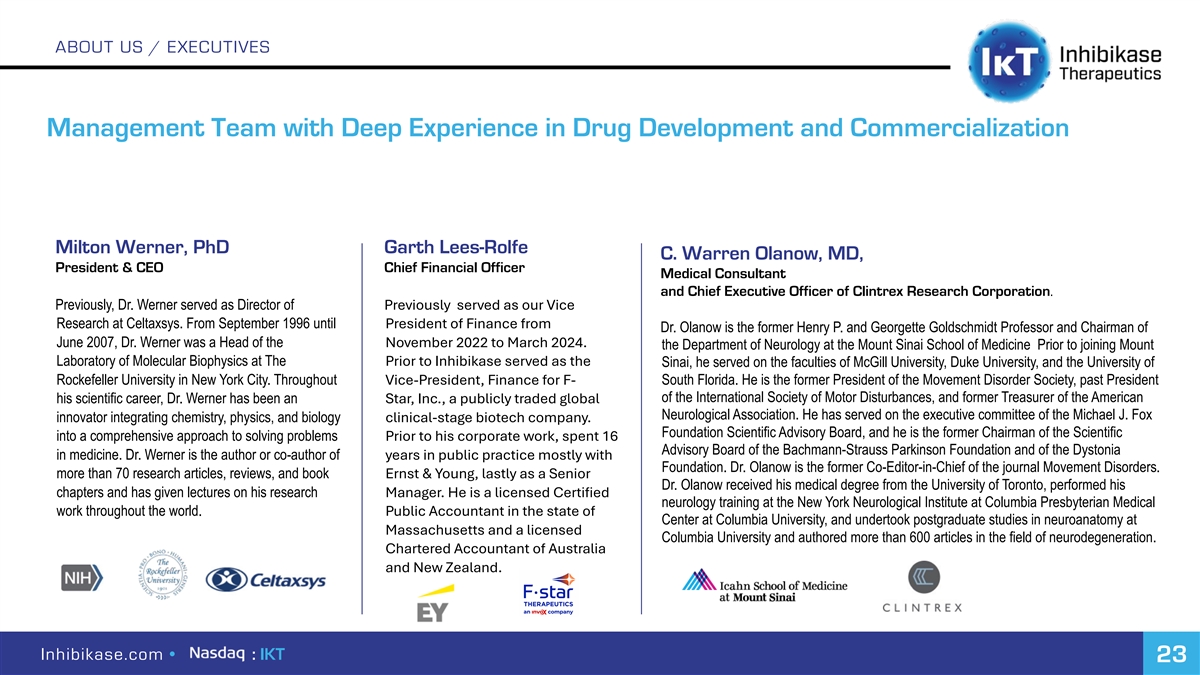 ABOUT US / EXECUTIVES Management Team with Deep Experience in Drug Development and Commercialization Milton Werner, PhD Garth Lees-Rolfe C. Warren Olanow, MD, President & CEO Chief Financial Officer Medical Consultant and Chief Executive Officer of Clintrex Research Corporation. Previously, Dr. Werner served as Director of Previously served as our Vice Research at Celtaxsys. From September 1996 until President of Finance from Dr. Olanow is the former Henry P. and Georgette Goldschmidt Professor and Chairman of June 2007, Dr. Werner was a Head of the November 2022 to March 2024. the Department of Neurology at the Mount Sinai School of Medicine Prior to joining Mount Laboratory of Molecular Biophysics at The Prior to Inhibikase served as the Sinai, he served on the faculties of McGill University, Duke University, and the University of Rockefeller University in New York City. Throughout Vice-President, Finance for F- South Florida. He is the former President of the Movement Disorder Society, past President of the International Society of Motor Disturbances, and former Treasurer of the American his scientific career, Dr. Werner has been an Star, Inc., a publicly traded global Neurological Association. He has served on the executive committee of the Michael J. Fox innovator integrating chemistry, physics, and biology clinical-stage biotech company. Foundation Scientific Advisory Board, and he is the former Chairman of the Scientific into a comprehensive approach to solving problems Prior to his corporate work, spent 16 Advisory Board of the Bachmann-Strauss Parkinson Foundation and of the Dystonia in medicine. Dr. Werner is the author or co-author of years in public practice mostly with Foundation. Dr. Olanow is the former Co-Editor-in-Chief of the journal Movement Disorders. more than 70 research articles, reviews, and book Ernst & Young, lastly as a Senior Dr. Olanow received his medical degree from the University of Toronto, performed his chapters and has given lectures on his research Manager. He is a licensed Certified neurology training at the New York Neurological Institute at Columbia Presbyterian Medical work throughout the world. Public Accountant in the state of Center at Columbia University, and undertook postgraduate studies in neuroanatomy at Massachusetts and a licensed Columbia University and authored more than 600 articles in the field of neurodegeneration. Chartered Accountant of Australia and New Zealand. Inhibikase.com • : IKT 23