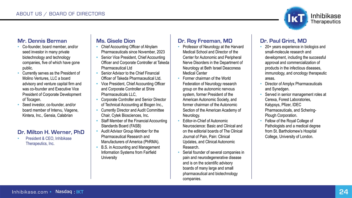 ABOUT US / BOARD OF DIRECTORS Mr. Dennis Berman Ms. Gisele Dion Dr. Roy Freeman, MD Dr. Paul Grint, MD • Co-founder, board member, and/or • Chief Accounting Officer of Alnylam • Professor of Neurology at the Harvard • 20+ years experience in biologics and seed investor in many private Pharmaceuticals since November, 2023 Medical School and Director of the small-molecule research and biotechnology and technology • Senior Vice President, Chief Accounting Center for Autonomic and Peripheral development, including the successful companies, five of which have gone Officer and Corporate Controller at Takeda Nerve Disorders in the Department of approval and commercialization of public. Pharmaceutical Ltd Neurology at Beth Israel Deaconess products in the infectious diseases, • Currently serves as the President of • Senior Advisor to the Chief Financial Medical Center immunology, and oncology therapeutic Molino Ventures, LLC a board Officer of Takeda Pharmaceutical Ltd. • Former chairman of the World areas. advisory and venture capital firm and • Vice President, Chief Accounting Officer Federation of Neurology research • Director of Amplyx Pharmaceuticals was co-founder and Executive Vice and Corporate Controller at Shire group on the autonomic nervous and Synedgen. President of Corporate Development Pharmaceuticals LLC, system, former President of the • Served in senior management roles at of Tocagen. • Corporate Controller and Senior Director American Autonomic Society, and Cerexa, Forest Laboratories, • Seed investor, co-founder, and/or of Technical Accounting at Biogen Inc., former chairman of the Autonomic Kalypsys, Pfizer, IDEC board member of Intervu, Viagene, • Currently Director and Audit Committee Section of the American Academy of Pharmaceuticals, and Schering- Kintera, Inc., Gensia, Calabrian Chair, Cytek Biosciences, Inc. Neurology. Plough Corporation. • Staff Member of the Financial Accounting • Editor-in-Chief of Autonomic • Fellow of the Royal College of Standards Board (FASB) Neuroscience: Basic and Clinical and Pathologists and a medical degree • Audit Advisor Group Member for the on the editorial boards of The Clinical from St. Bartholomew’s Hospital Dr. Milton H. Werner, PhD Pharmaceutical Research and Journal of Pain, Pain: Clinical College, University of London. • President & CEO, Inhibikase Manufacturers of America (PhRMA). Updates, and Clinical Autonomic Therapeutics, Inc. • B.S. in Accounting and Management Research. Information Systems from Fairfield • Serial founder of several companies in University pain and neurodegenerative disease and is on the scientific advisory boards of many large and small pharmaceutical and biotechnology companies. Inhibikase.com • : IKT 24