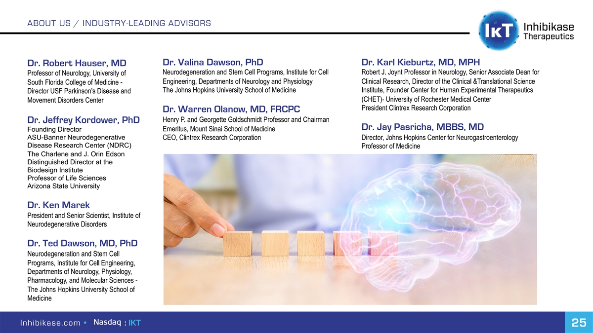 ABOUT US / INDUSTRY-LEADING ADVISORS Dr. Valina Dawson, PhD Dr. Karl Kieburtz, MD, MPH Dr. Robert Hauser, MD Neurodegeneration and Stem Cell Programs, Institute for Cell Robert J. Joynt Professor in Neurology, Senior Associate Dean for Professor of Neurology, University of Engineering, Departments of Neurology and Physiology Clinical Research, Director of the Clinical &Translational Science South Florida College of Medicine - The Johns Hopkins University School of Medicine Institute, Founder Center for Human Experimental Therapeutics Director USF Parkinson’s Disease and (CHET)- University of Rochester Medical Center Movement Disorders Center President Clintrex Research Corporation Dr. Warren Olanow, MD, FRCPC Henry P. and Georgette Goldschmidt Professor and Chairman Dr. Jeffrey Kordower, PhD Dr. Jay Pasricha, MBBS, MD Emeritus, Mount Sinai School of Medicine Founding Director ASU-Banner Neurodegenerative CEO, Clintrex Research Corporation Director, Johns Hopkins Center for Neurogastroenterology Disease Research Center (NDRC) Professor of Medicine The Charlene and J. Orin Edson Distinguished Director at the Biodesign Institute Professor of Life Sciences Arizona State University Dr. Ken Marek President and Senior Scientist, Institute of Neurodegenerative Disorders Dr. Ted Dawson, MD, PhD Neurodegeneration and Stem Cell Programs, Institute for Cell Engineering, Departments of Neurology, Physiology, Pharmacology, and Molecular Sciences - The Johns Hopkins University School of Medicine Inhibikase.com • : IKT 25