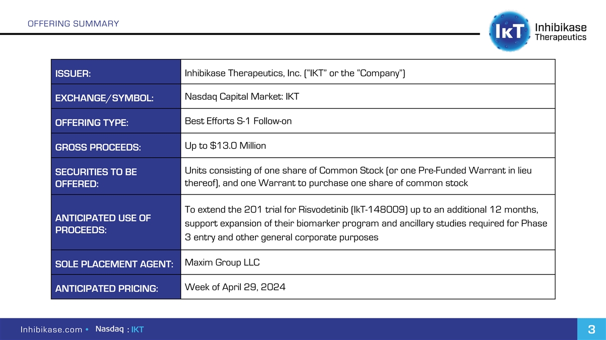 OFFERING SUMMARY Inhibikase Therapeutics, Inc. (“IKT” or the “Company”) ISSUER: Nasdaq Capital Market: IKT EXCHANGE/SYMBOL: Best Efforts S-1 Follow-on OFFERING TYPE: Up to $13.0 Million GROSS PROCEEDS: Units consisting of one share of Common Stock (or one Pre-Funded Warrant in lieu SECURITIES TO BE thereof), and one Warrant to purchase one share of common stock OFFERED: To extend the 201 trial for Risvodetinib (IkT-148009) up to an additional 12 months, ANTICIPATED USE OF support expansion of their biomarker program and ancillary studies required for Phase PROCEEDS: 3 entry and other general corporate purposes Maxim Group LLC SOLE PLACEMENT AGENT: Week of April 29, 2024 ANTICIPATED PRICING: Inhibikase.com • : IKT 3