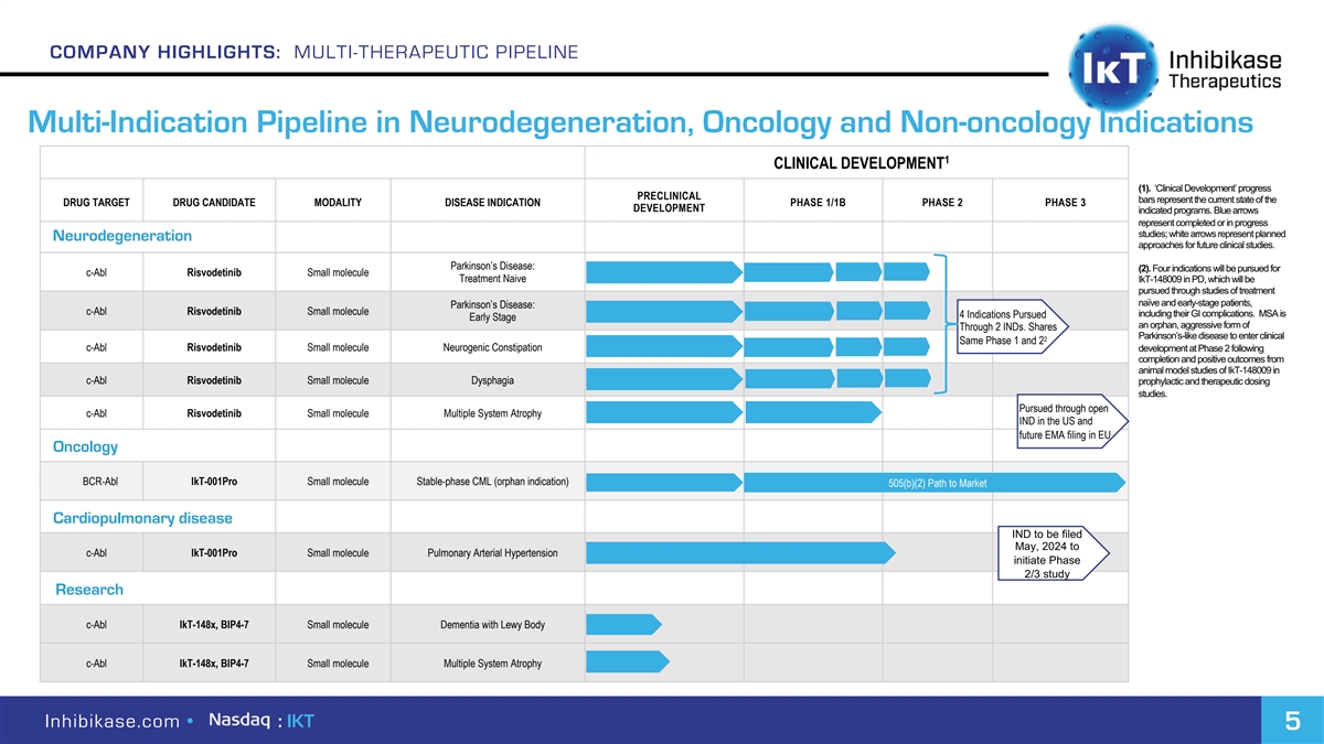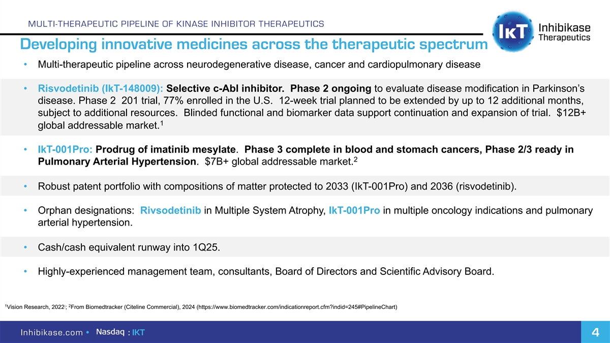 MULTI-THERAPEUTIC PIPELINE OF KINASE INHIBITOR THERAPEUTICS Developing innovative medicines across the therapeutic spectrum • Multi-therapeutic pipeline across neurodegenerative disease, cancer and cardiopulmonary disease • Risvodetinib (IkT-148009): Selective c-Abl inhibitor. Phase 2 ongoing to evaluate disease modification in Parkinson’s disease. Phase 2 201 trial, 77% enrolled in the U.S. 12-week trial planned to be extended by up to 12 additional months, subject to additional resources. Blinded functional and biomarker data support continuation and expansion of trial. $12B+ 1 global addressable market. • IkT-001Pro: Prodrug of imatinib mesylate. Phase 3 complete in blood and stomach cancers, Phase 2/3 ready in 2 Pulmonary Arterial Hypertension. $7B+ global addressable market. • Robust patent portfolio with compositions of matter protected to 2033 (IkT-001Pro) and 2036 (risvodetinib). • Orphan designations: Rivsodetinib in Multiple System Atrophy, IkT-001Pro in multiple oncology indications and pulmonary arterial hypertension. • Cash/cash equivalent runway into 1Q25. • Highly-experienced management team, consultants, Board of Directors and Scientific Advisory Board. 1 ; 2 Vision Research, 2022 ; From Biomedtracker (Citeline Commercial), 2024 (https://www.biomedtracker.com/indicationreport.cfm?indid=245#PipelineChart) Inhibikase.com • : IKT 4
