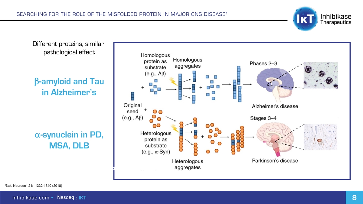 1 SEARCHING FOR THE ROLE OF THE MISFOLDED PROTEIN IN MAJOR CNS DISEASE Different proteins, similar pathological effect b-amyloid and Tau in Alzheimer’s a-synuclein in PD, MSA, DLB What role does the misfolded protein play? 1 Nat. Neurosci. 21: 1332-1340 (2018) Inhibikase.com • : IKT 8