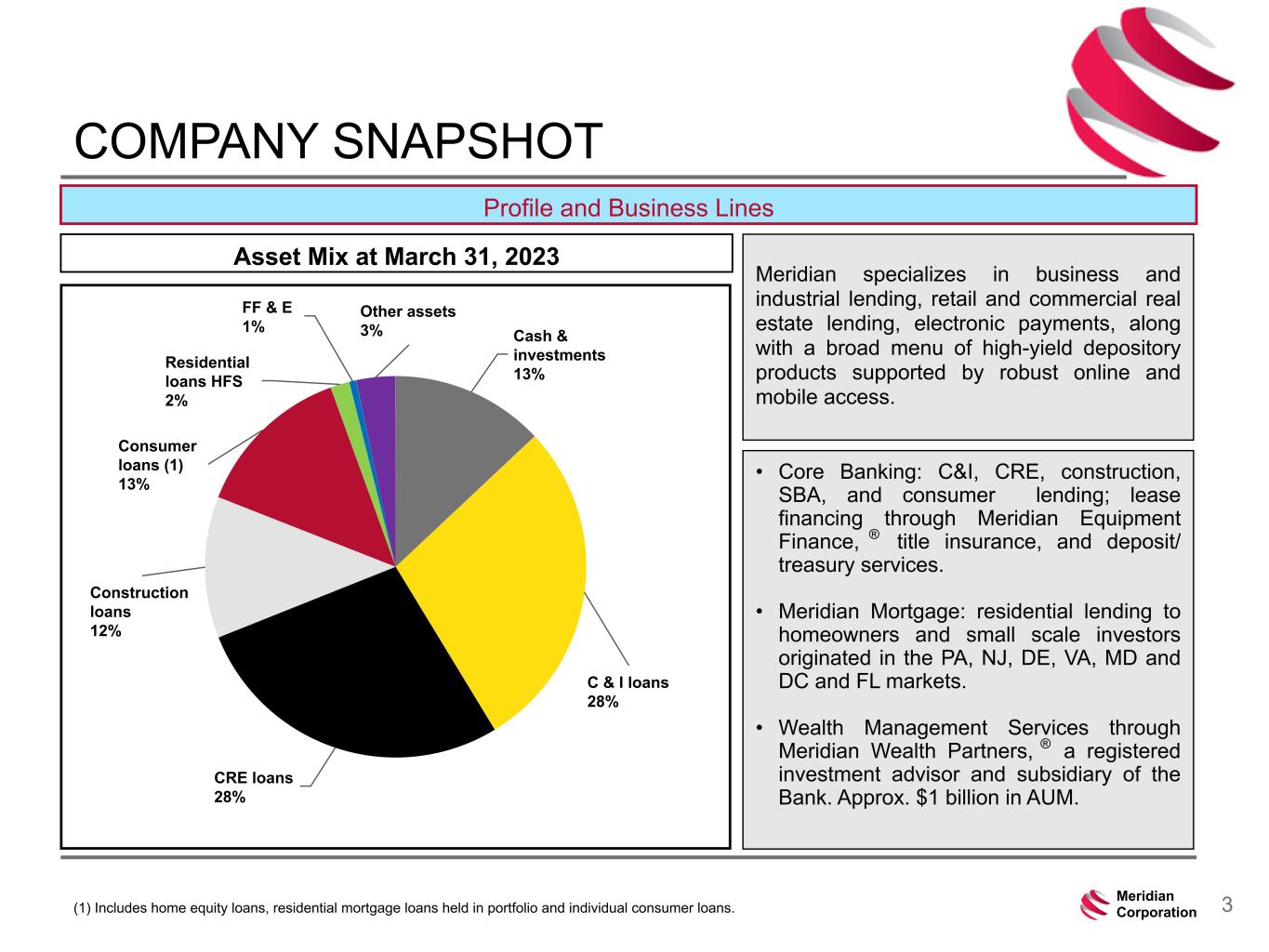 239 15 75 111 111 113 186 12 47 0 0 0 234 234 234 186 12 0 112 173 71 2Meridian Corporation FORWARD-LOOKING STATEMENTS Meridian Corporation (the “Corporation”) may from time to time make written or oral “forward-looking statements” within the meaning of the “safe harbor” provisions of the Private Securities Litigation Reform Act of 1995. These forward-looking statements include statements with respect to Meridian Corporation’s strategies, goals, beliefs, expectations, estimates, intentions, capital raising efforts, financial condition and results of operations, future performance and business. Statements preceded by, followed by, or that include the words “may,” “could,” “should,” “pro forma,” “looking forward,” “would,” “believe,” “expect,” “anticipate,” “estimate,” “intend,” “plan,” or similar expressions generally indicate a forward-looking statement. These forward-looking statements involve risks and uncertainties that are subject to change based on various important factors (some of which, in whole or in part, are beyond Meridian Corporation’s control). Numerous competitive, economic, regulatory, legal and technological factors, risks and uncertainties that could cause actual results to differ materially include, without limitation, the impact of the COVID-19 pandemic and government responses thereto; on the U.S. economy, including the markets in which we operate; actions that we and our customers take in response to these factors and the effects such actions have on our operations, products, services and customer relationships; and the risk that the Small Business Administration may not fund some or all Paycheck Protection Program (PPP) loan guaranties; increased competitive pressures; changes in the interest rate environment; changes in general economic conditions and conditions within the securities markets; legislative and regulatory changes; and the effects of inflation, a potential recession, among others, could cause Meridian Corporation’s financial performance to differ materially from the goals, plans, objectives, intentions and expectations expressed in such forward-looking statements. Meridian Corporation cautions that the foregoing factors are not exclusive, and neither such factors nor any such forward-looking statement takes into account the impact of any future events. All forward- looking statements and information set forth herein are based on management’s current beliefs and assumptions as of the date hereof and speak only as of the date they are made. For a more complete discussion of the assumptions, risks and uncertainties related to our business, you are encouraged to review Meridian Corporation’s filings with the Securities and Exchange Commission, including our Annual Report on Form 10-K for the year ended December 31, 2022 and subsequently filed quarterly reports on Form 10-Q and current reports on Form 8-K that update or provide information in addition to the information included in the Form 10-K and Form 10-Q filings, if any. Meridian Corporation does not undertake to update any forward-looking statement whether written or oral, that may be made from time to time by Meridian Corporation or by or on behalf of Meridian Bank.