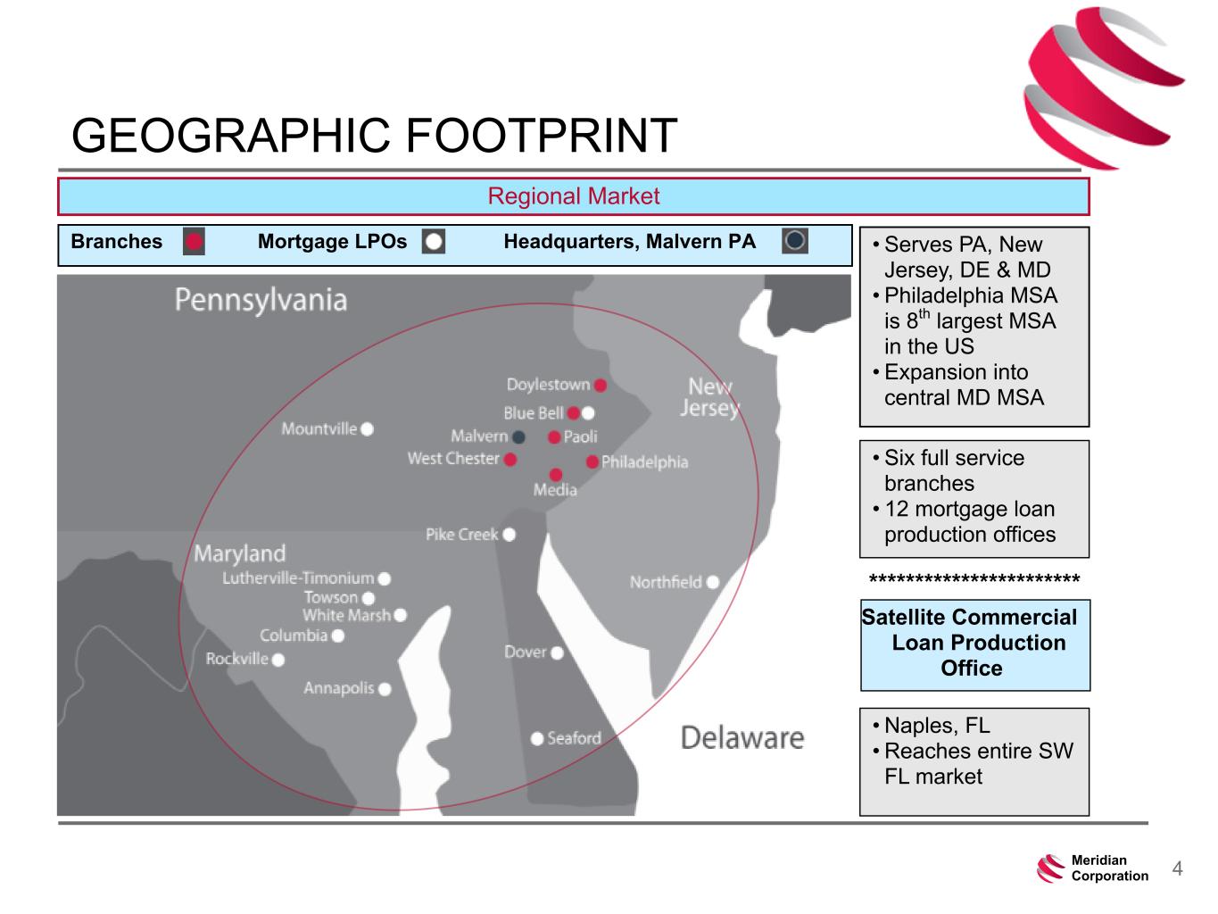 239 15 75 111 111 113 186 12 47 0 0 0 234 234 234 186 12 0 112 173 71 3Meridian Corporation COMPANY SNAPSHOT (1) Includes home equity loans, residential mortgage loans held in portfolio and individual consumer loans. Profile and Business Lines • Core Banking: C&I, CRE, construction, SBA, and consumer lending; lease financing through Meridian Equipment Finance, ® title insurance, and deposit/ treasury services. • Meridian Mortgage: residential lending to homeowners and small scale investors originated in the PA, NJ, DE, VA, MD and DC and FL markets. • Wealth Management Services through Meridian Wealth Partners, ® a registered investment advisor and subsidiary of the Bank. Approx. $1 billion in AUM. Meridian specializes in business and industrial lending, retail and commercial real estate lending, electronic payments, along with a broad menu of high-yield depository products supported by robust online and mobile access. Cash & investments 13% C & I loans 28% CRE loans 28% Construction loans 12% Consumer loans (1) 13% Residential loans HFS 2% FF & E 1% Other assets 3% Asset Mix at March 31, 2023