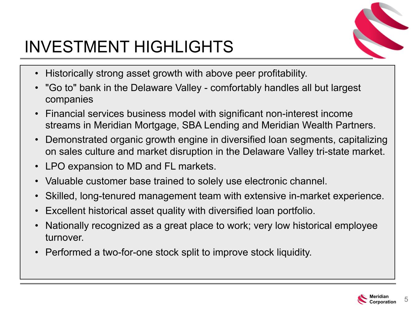 239 15 75 111 111 113 186 12 47 0 0 0 234 234 234 186 12 0 112 173 71 4Meridian Corporation GEOGRAPHIC FOOTPRINT Branches Mortgage LPOs Headquarters, Malvern PA • Serves PA, New Jersey, DE & MD • Philadelphia MSA is 8th largest MSA in the US • Expansion into central MD MSA Regional Market • Six full service branches • 12 mortgage loan production offices • Naples, FL • Reaches entire SW FL market *********************** Satellite Commercial Loan Production Office