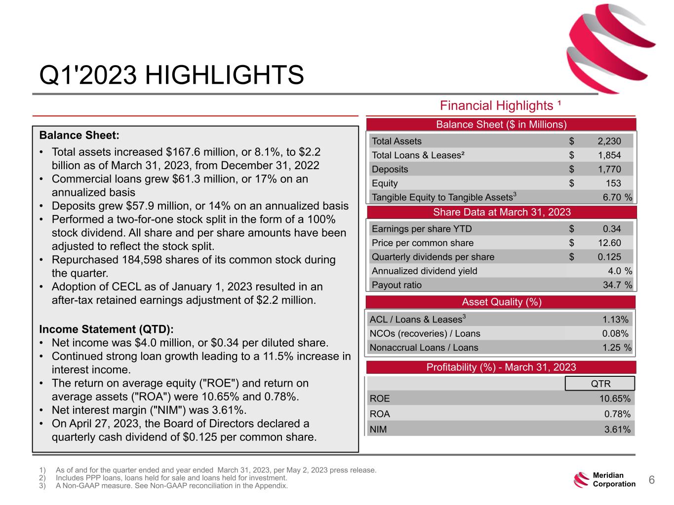 239 15 75 111 111 113 186 12 47 0 0 0 234 234 234 186 12 0 112 173 71 6Meridian Corporation Q1'2023 HIGHLIGHTS 1) As of and for the quarter ended and year ended March 31, 2023, per May 2, 2023 press release. 2) Includes PPP loans, loans held for sale and loans held for investment. 3) A Non-GAAP measure. See Non-GAAP reconciliation in the Appendix. Financial Highlights ¹ Balance Sheet ($ in Millions) Profitability (%) - March 31, 2023 Asset Quality (%) Balance Sheet: • Total assets increased $167.6 million, or 8.1%, to $2.2 billion as of March 31, 2023, from December 31, 2022 • Commercial loans grew $61.3 million, or 17% on an annualized basis • Deposits grew $57.9 million, or 14% on an annualized basis • Performed a two-for-one stock split in the form of a 100% stock dividend. All share and per share amounts have been adjusted to reflect the stock split. • Repurchased 184,598 shares of its common stock during the quarter. • Adoption of CECL as of January 1, 2023 resulted in an after-tax retained earnings adjustment of $2.2 million. Income Statement (QTD): • Net income was $4.0 million, or $0.34 per diluted share. • Continued strong loan growth leading to a 11.5% increase in interest income. • The return on average equity ("ROE") and return on average assets ("ROA") were 10.65% and 0.78%. • Net interest margin ("NIM") was 3.61%. • On April 27, 2023, the Board of Directors declared a quarterly cash dividend of $0.125 per common share. Total Assets $ 2,230 Total Loans & Leases² $ 1,854 Deposits $ 1,770 Equity $ 153 Tangible Equity to Tangible Assets3 6.70 % QTR ROE 10.65% ROA 0.78% NIM 3.61% ACL / Loans & Leases3 1.13% NCOs (recoveries) / Loans 0.08% Nonaccrual Loans / Loans 1.25 % Earnings per share YTD $ 0.34 Price per common share $ 12.60 Quarterly dividends per share $ 0.125 Annualized dividend yield 4.0 % Payout ratio 34.7 % Share Data at March 31, 2023